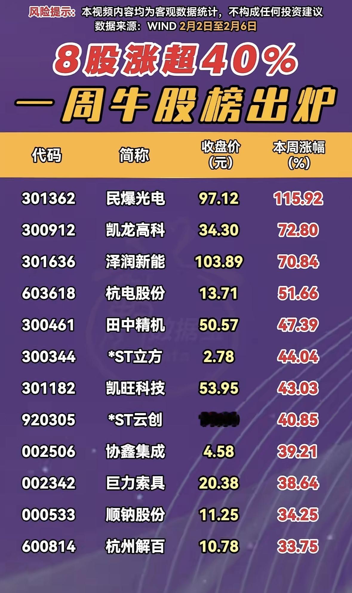 一周牛股榜出炉!8股涨超40%,快来抓住机会!📈💰 一周牛股榜出炉,多股涨幅亮眼,数据仅供参考不构成投资建议。