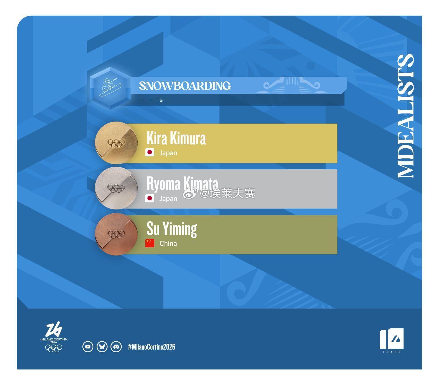 米兰冬奥会单板滑雪男子大跳台决赛,苏翊鸣第九个出场,总分168.5分获得铜牌,也是中国队本届冬奥会首枚奖牌。日本选手木村葵来179.5分夺得金牌,木俣椋真171.5分夺得银牌。v观冬奥会