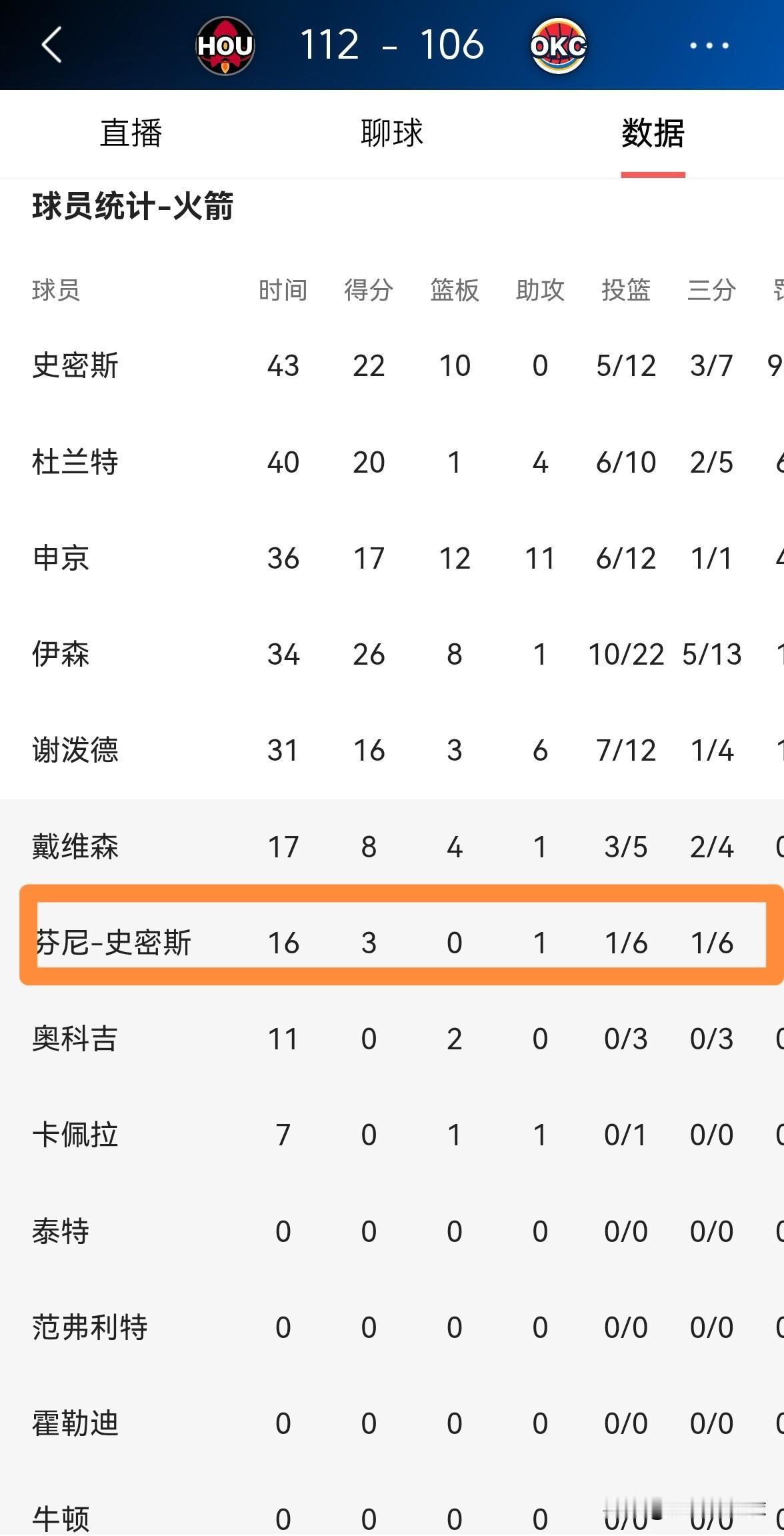 火箭大将芬尼-史密斯的三分球真是让人感到绝望!在今天火箭客场以112:106战胜雷霆的比赛中,芬尼-史密斯在三分线外一如既往的手感冰凉,他在替补出战的16分钟里,三分球6中1极其低效的得到3分,还有2次犯规,他的场上正负值为-9。 实事求是的说,我对芬尼-史密斯的三分球已经彻底的绝望了,我不再相信芬尼-史密斯的三分球了。