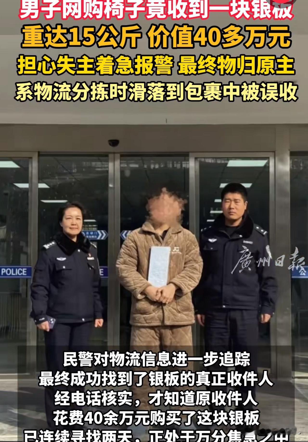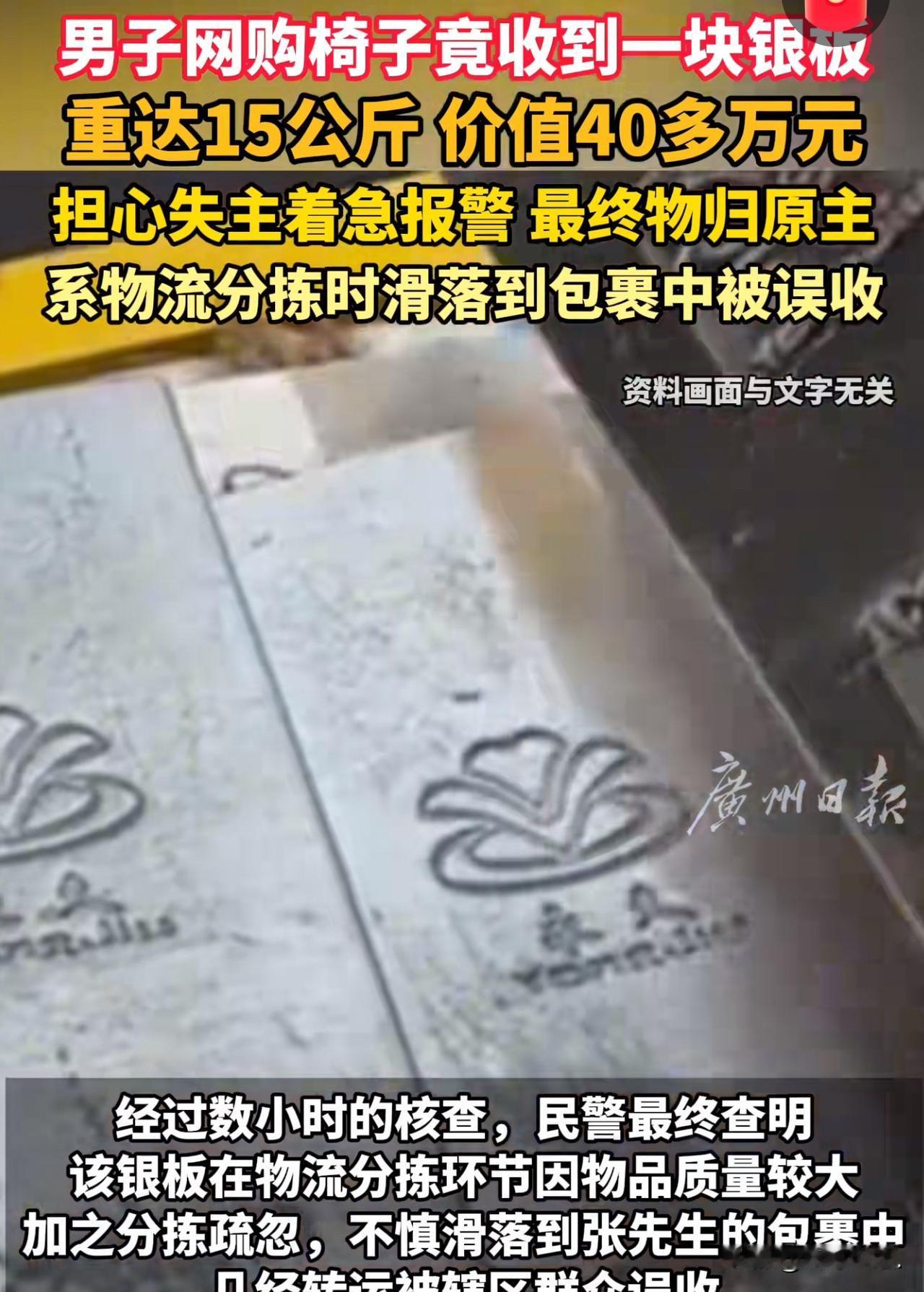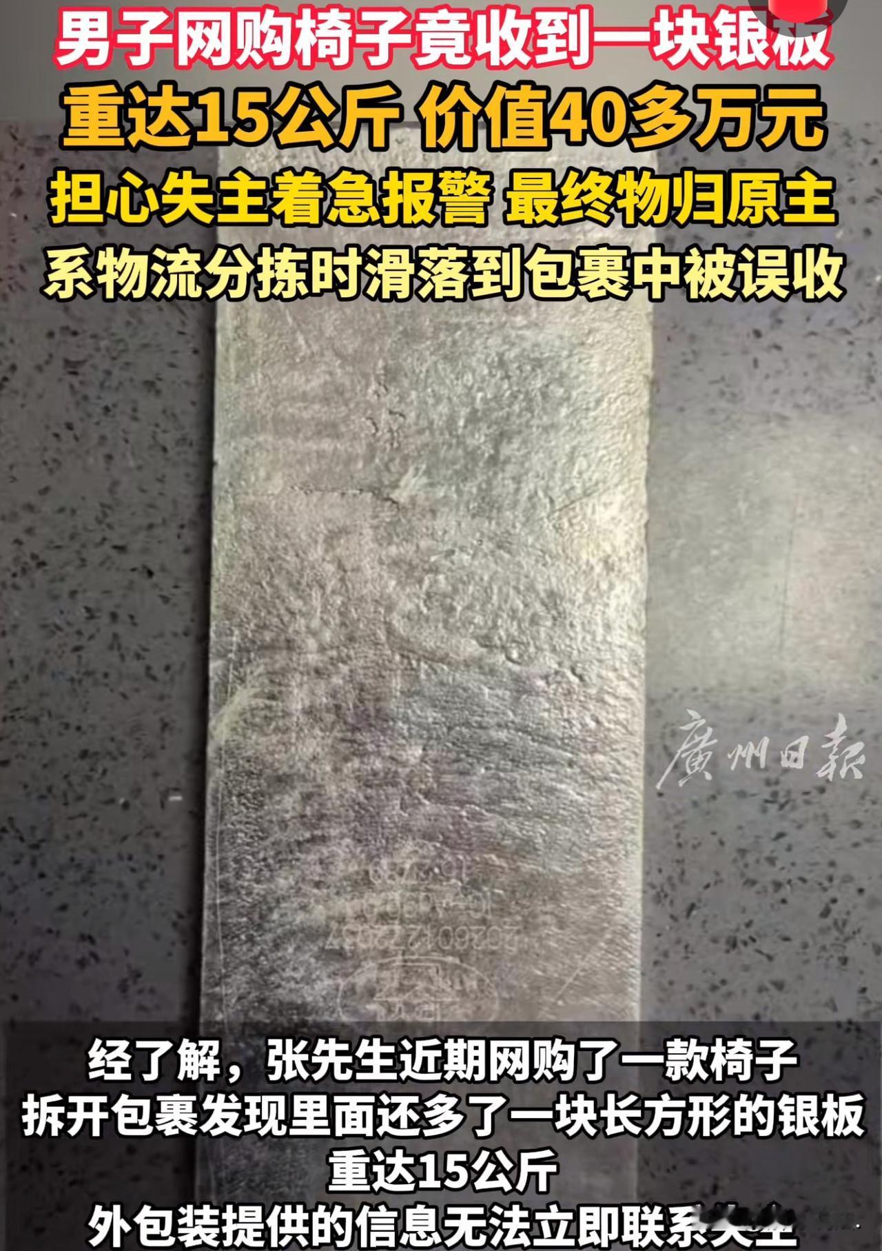 湖北十堰,一男子网购椅子,到货后发现里面有15公斤重的银砖,男子懵了,赶紧报警,民警调查后发现,这块银砖是物流分拣时滑落到包裹,越狱到男子的快递包裹中的。警方找到了银砖的主人,这块银砖是对方花40多万在网上入手的,没想到会丢失,急得直跺脚。 失主对男子和民警表达了万分感谢。网友调侃:迟到两天,变成38万了! 2月3日,张先生网购的一套椅子,到货了,他拆开包装准备组装的时候,突然摸到个硬邦邦的大家伙,裹得严严实实的,还挺沉。 他心里犯着嘀咕,椅子配件也不会这么沉啊! 扒拉开一看,好家伙,居然是块闪着银光的长方形银砖,掂量着足足有15公斤重! 张先生当场就懵了,手里捧着银砖都忘了放下,自己买的明明是几百块的椅子,怎么还送这么贵重的“赠品”? 难不成是商家的隐藏福利?可转念一想,哪有福利送40多万银砖的? 一瞬间,张先生心里又慌又乱:这玩意儿太值钱了,要是私留着,万一被找上门,说不清楚可就麻烦了! 包裹上就只有自己的收货信息,压根找不到这银砖的主人是谁。 他越想越忐忑,手里的银砖仿佛有千斤重,拿着不是、放着也不是,赶紧掏出手机报了警。 等民警赶来,接过银砖开始调查,张先生才稍微松了口气,但还是忍不住念叨:真是活久见,网购还能捡到这宝贝,就是心里不踏实,总觉得不是自己的东西,拿着烫手。 直到民警查出银砖是物流分拣时滑落“闯”进他的包裹,还联系上了失主,张先生悬着的心才彻底落地,脸上露出了释然的笑:总算找到主人了,不然我这觉都睡不踏实,现在物归原主,可算放心了! 这边张先生心里的石头落了地,那边河南的失主都快急疯了。 这块银砖是他花40多万买的,两天前物流就显示到货了,可他左等右等就是没收到,到处找都没头绪,差点以为丢了要跟快递公司索赔。 结果民警靠着快递公司的协助,通宵排查物流轨迹,总算把银砖还给了真正的主人。 失主拿到银砖的时候,又激动又庆幸,一个劲地感谢拾金不昧的张先生和认真负责的民警。 可评论区的网友们已经笑不活了,纷纷调侃:“失主估计心里又爱又恨吧!本来能找快递公司索赔,结果银砖找回来了,偏偏赶上银价暴跌,这波操作亏麻了! 心疼失主一秒钟,喜提失而复得的银砖,却丢了差价,这心情跟坐过山车似的。 不得不说,这事儿也太巧合了,网购椅子能拆出40多万的银砖,怕是全网独一份的经历。 《民法典》第314条规定:拾得遗失物,应当返还权利人。拾得人应当及时通知权利人领取,或者送交公安等有关部门。 也得亏张先生人品好,从一开始就没想着私吞,报警处理。如果张先生将这40多万白银据为己有,构成不当得利,会被追究法律责任。