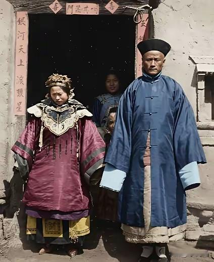 这是清朝末年北方农村一场基层官员婚礼的现场。 据介绍,新娘身着清朝早期的旗袍,如今我们所见的旗袍,皆是民国时期受西方国家影响改良后的样式。 新郎身着官服,身姿笔挺,现场却丝毫不见新郎新娘成婚应有的喜庆氛围。我个人觉得,在当时的农村,新郎身着官服成婚,想必会有高人一等之感。