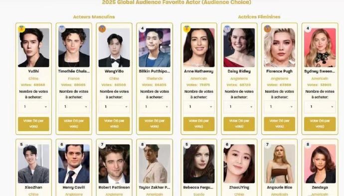 2025年欧洲世界电影节新增“全球观众最喜爱演员(观众选择奖)”,该奖项对标国内百花奖,由全球观众票选产生,国际投票排全球女明星赵丽颖第6,国内第一,赵丽颖还是太火了