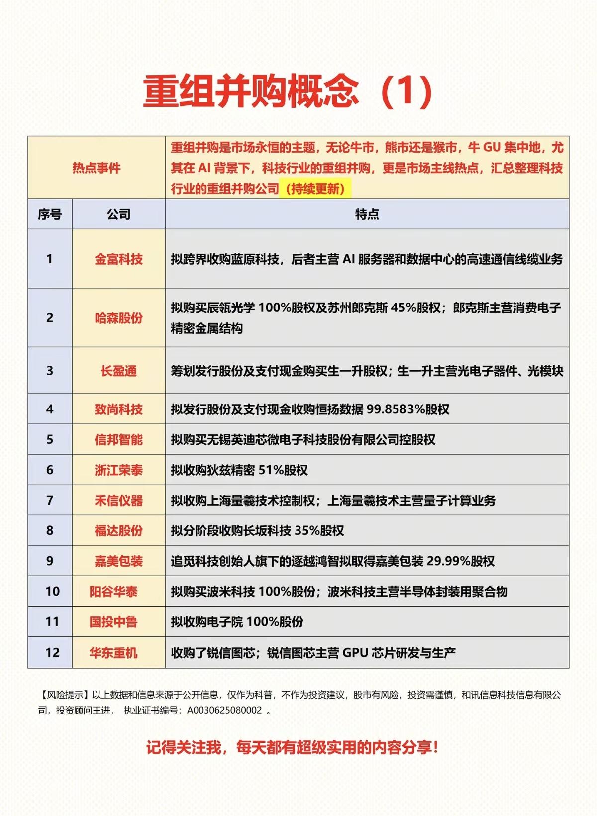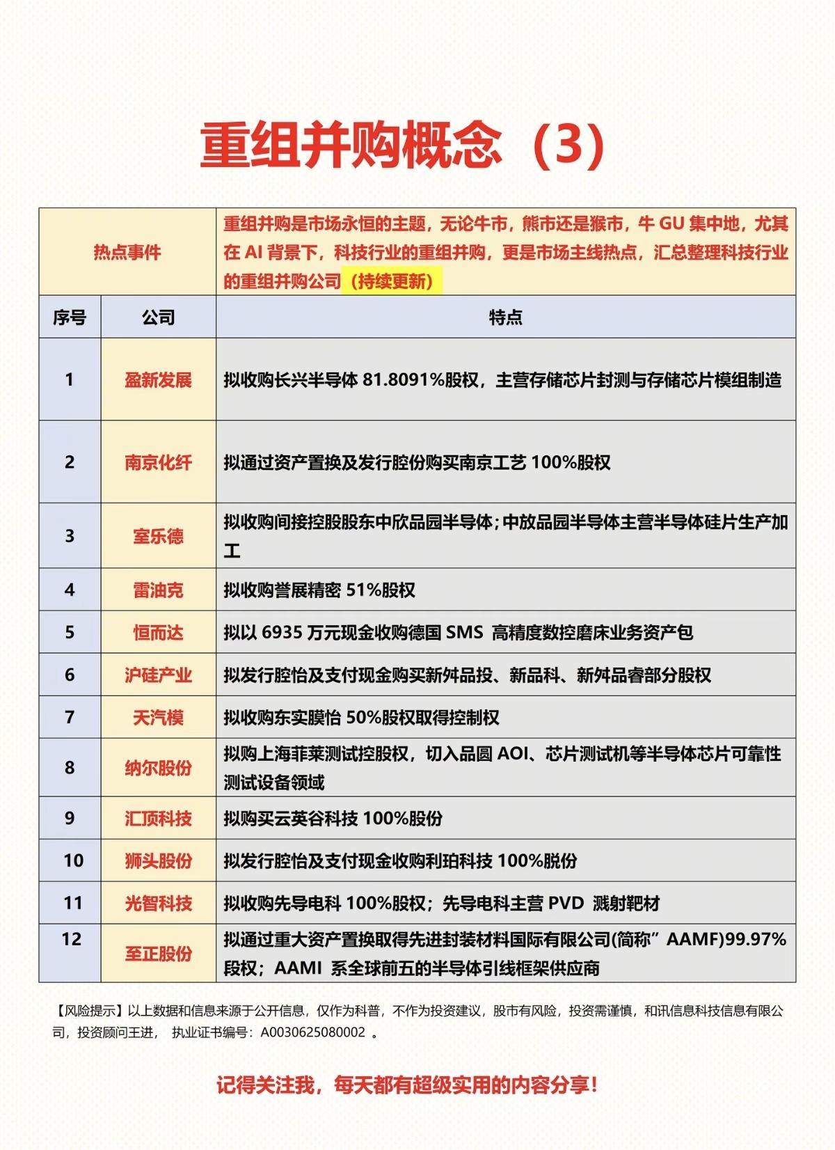 2.8周日 48家公司并购重组! 并购重组是市场永恒的主题,无论牛市熊市,都是牛股的集中地,尤其是科技的并购重组,更是难得的市场热点。 相关核心个股: