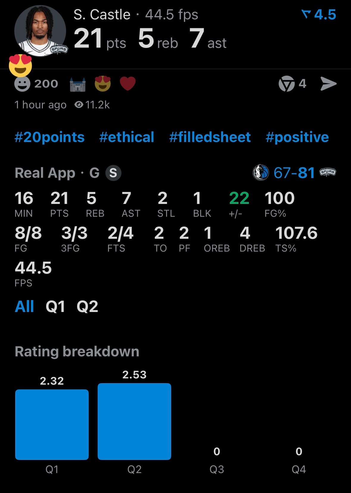 独行侠vs马刺 天赋溢出了,卡斯尔今天打的就是超级明星球,半场8/8还有7个助攻,防守也是相当出色,+22的正负值;卡布突然开窍,秒变顶级三D,这体验卡一下就满突了?