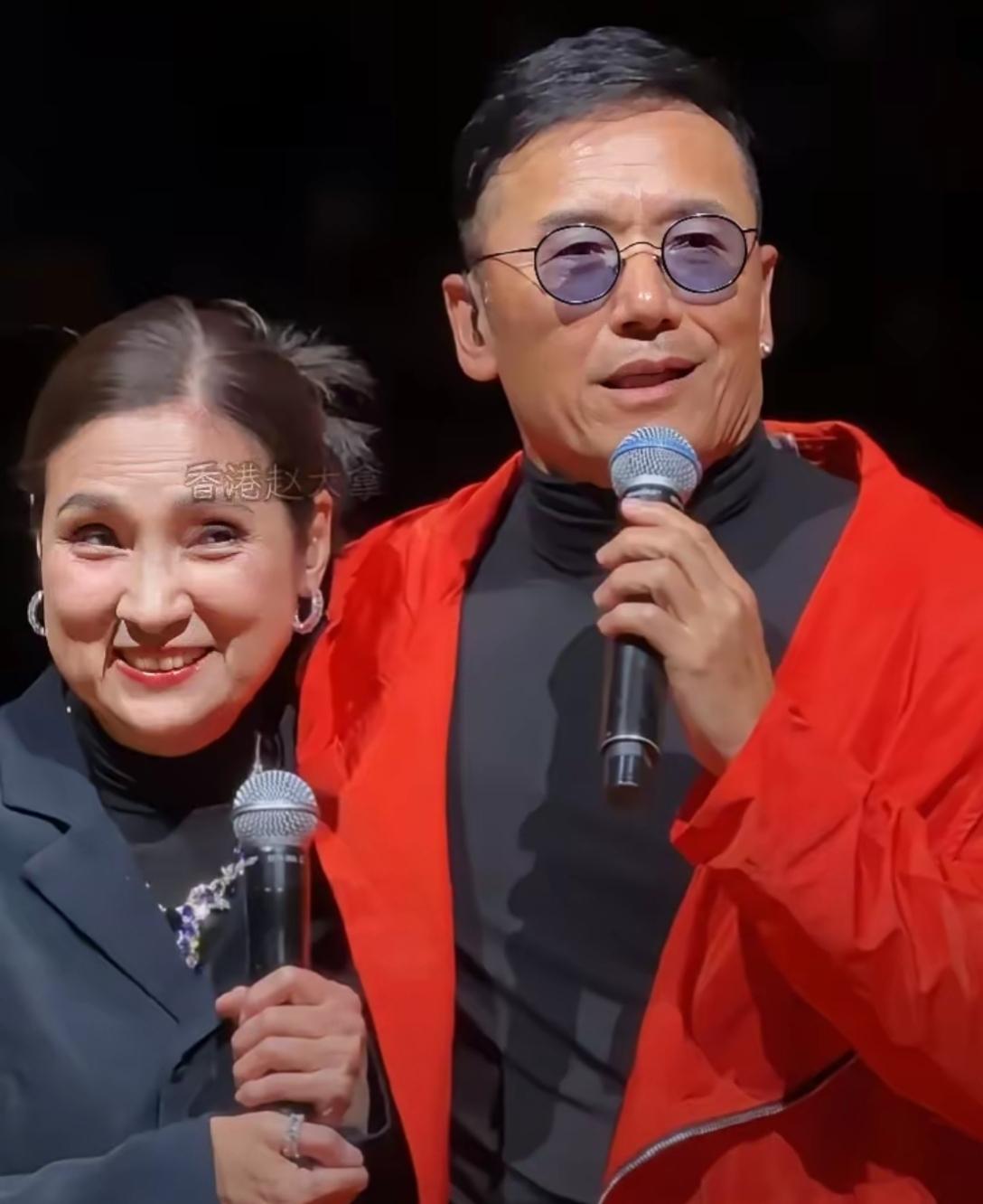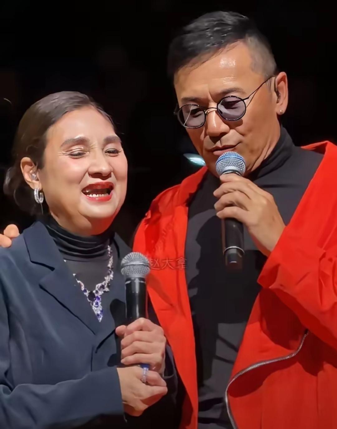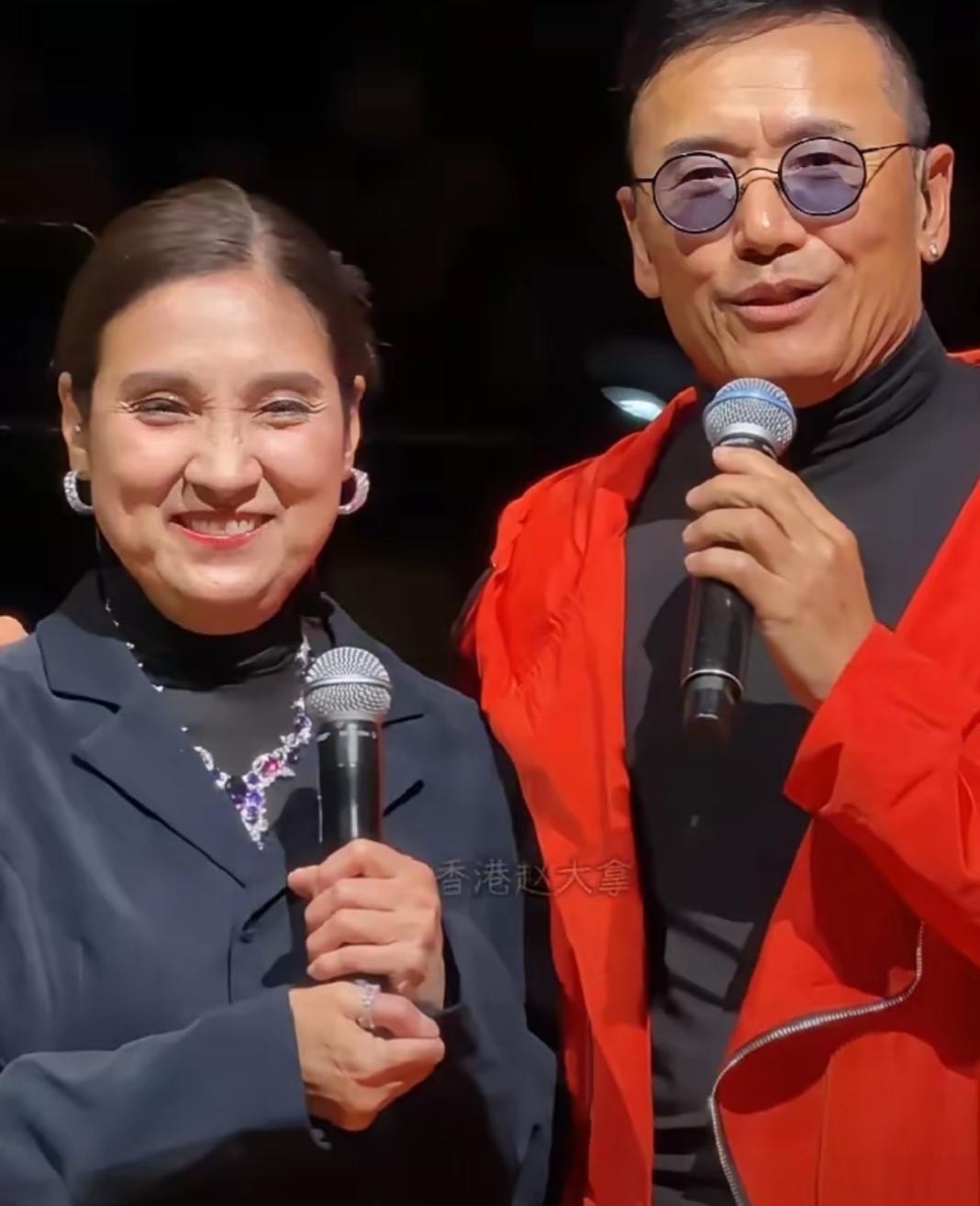 哇哦,画面中身着红色外衣的苗侨伟肤黄发稀,方颐大耳,眼角耷拉,鼻头丰隆圆亮,下巴周围褶子密布,戴着眼镜本应顿生文气,可左耳亮闪闪的耳钉实在雷人;一旁的戚美珍樱唇榴齿,珠围翠绕,眼角皱纹粗粝,双下巴明显,大拇指指环抢镜,一对神仙眷侣在岁月中已然老去!