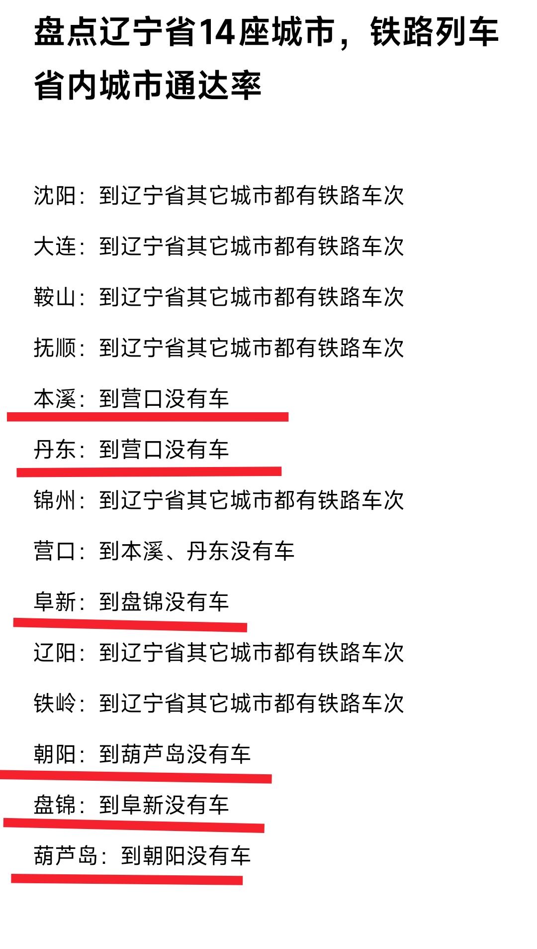 目前来看丹东到营口没有直达的铁路列车,盘锦到阜新没有直达的铁路列车,朝阳到葫芦岛没有直达的铁路列车。相比之下作为辽宁省最后开通高铁的抚顺到辽宁省其他它13座城市都有直达的铁路列车,这方面确实值得很多城市学习。 放眼未来我认为丹东到营口、盘锦到阜新开通直达的铁路可是应该是件很轻松的事情,从技术层面考虑没有任何难题。 唯一的困难就是朝阳到葫芦岛之间是很难开通直达的铁路车次。因为辽宁朝阳站目前没有绿皮车,葫芦岛没有接入京沈高铁的联络线,因此朝阳到葫芦岛想要开通的铁路车次短期来看最可靠的方式就是让朝阳南站恢复绿皮车。