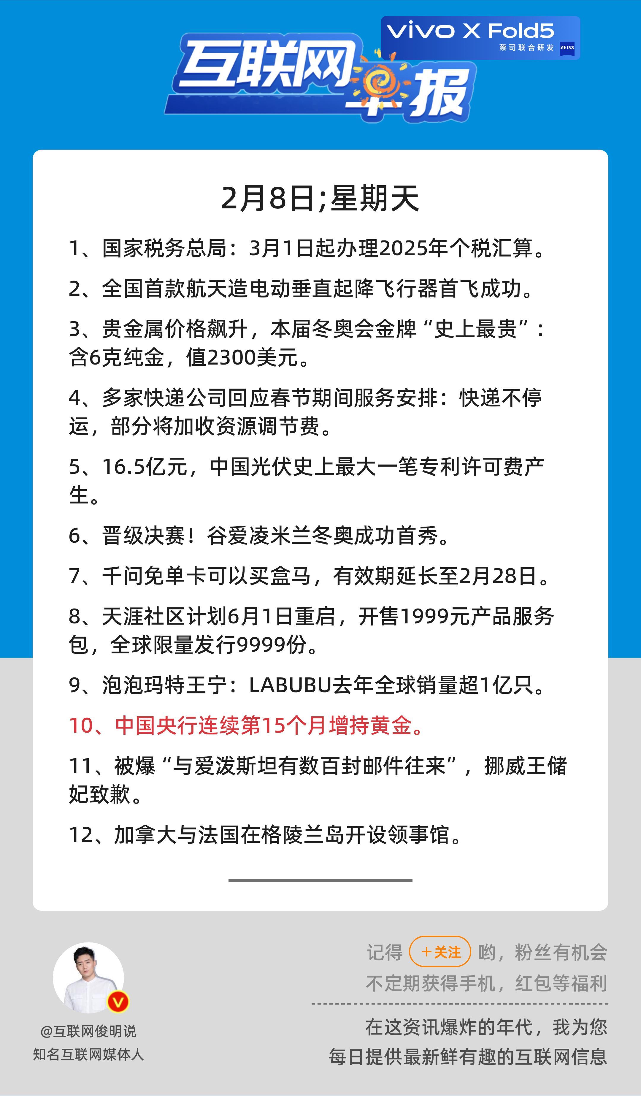2月8日,星期天,《第3043期》;互联网早报,众览天下事关心第10条:中国央行连续第15个月增持黄金;早安————————————点击右上方关注每天一分钟众览天下事,互联网早报值得拥有! 更多精彩,欢迎加入粉丝群俊明和他的朋友们