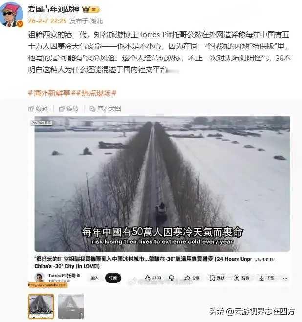 百万粉博主双标造谣太恶心! 吃中国饭砸中国碗, 强烈要求平台强制降粉严惩 祖籍西安的港二代博主Torres Pit,外网公然造谣“中国每年50万人冻死”,内地抖音却换模糊说辞“可能有丧命风险”,一条视频两套嘴脸,一边靠国内旅游资源吸粉百万赚红利,一边肆意抹黑祖国民生,无任何官方数据支撑的谣言纯系恶意杜撰,被戳穿后还慌忙剪辑外网视频删改内容,心虚至极! 网络不是法外之地,造谣传谣本就触碰《治安管理处罚法》,情节严重者更涉嫌刑事犯罪 。近期平台已有明确先例,千万粉违规账号因传播不实信息等行为,被系统强制清除千万粉丝、限制关注,抖音更是明确将造谣传谣列为重点整治行为,可采取限流、清粉、封禁等阶梯式处罚 。 该博主一边享受中国发展红利,一边在外网抹黑祖国,这种吃里扒外的行径,既违背自媒体职业操守,更严重伤害国人感情、扰乱网络舆论!我们强烈要求平台依法依规启动强制降粉措施,清除其靠违规造谣积累的粉丝,同时采取限流、下架违规内容等处罚,对这种双标造谣者零容忍,绝不让其继续逍遥法外污染网络环境! 支持的网友一起转发,让平台看到民意,严惩吃中国饭砸中国碗的造谣者!