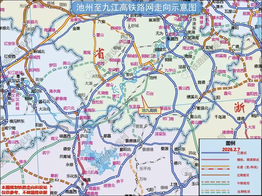 2026年2月7日,九江市发改委正式发布九江至池州铁路前期研究项目磋商公告,标志着池九高铁预可行性研究进入实质执行阶段,这条规划多年、串联皖赣两省的长江南岸沿江高铁通道,迎来关键性推进节点。 作为长江经济带铁路网的重要组成,池九高铁规划走向已初步明晰,线路西起江西九江,途经湖口、彭泽,北上接入安徽东至、石台,终至池州市区,全线总长约202公里,其中九江境内段落约90公里。项目拟按高速铁路标准规划建设,初期研究时速350公里方案,整体投资规模预计突破300亿元,建成后将在池州枢纽同步衔接宁安客专与合池高铁。结合周边武九、昌九、宁安等既有线路均为250公里/小时标准,项目最终批复时速更大概率按250公里/小时确定。 从建设节奏来看,池九高铁暂不具备近期开工条件,综合研判预计在“十五五”中后期方可启动实施。核心制约主要来自两方面:一是国家严格管控高铁并行线路建设,当前京港高铁安庆至九江段运力利用率未达饱和,需等待通道全线贯通后运量稳步提升;二是项目尚未纳入国家核心建设规划,皖赣两省正持续对接国家部委与国铁集团,全力争取将项目列入国家“十五五”铁路发展规划及新一轮中长期铁路网规划,获取上位政策支撑。 近年来,项目前期论证持续深化。2025年6月,武汉召开的规划方案评审会明确要求结合区域发展需求优化功能定位、加快前期进度;沿线地方政府同步加大推进力度,彭泽等地多次向上汇报争取,推动组建跨省协同机制,力争提升项目国家干线定位,缓解地方出资压力。线路规划核心目标之一,是填补彭泽、东至、石台三县高铁覆盖空白,其中石台县设站方案仍在比选,受地理廊道限制,存在近城绕行与远城设站两种思路,最终走向与站点布局需在可行性研究阶段定型。 路网层面,池九高铁的战略价值十分突出。当前池州至九江高铁绕行最快需1.5小时,普速铁路耗时达2.5小时,高铁建成后两地通行时间将压缩至1小时以内,大幅提升皖赣沿江城市通勤效率。线路衔接合池、池黄高铁后,可构建合肥—池州—九江纵向高铁走廊,强化池州区域交通枢纽地位,结束沿线县市直达合肥无高铁的历史。 同时,该线路与宁安高铁、规划中的池州—铜陵—宣城高铁连通,将打通南京、杭州至武汉的沿江高铁新通路,强化安徽沿江城市与武汉、南昌、长沙等长江中游城市群的快速联动。此外,湘赣两省正推进长沙至九江(南昌)高铁规划,该项目可作为池九高铁向西延伸的重要组成,补齐长沙东北向高铁路网短板,助力长沙“米字型”高铁枢纽建设,形成长三角直达湘赣地区的高铁便捷通道。 截至2026年2月,池九高铁仍处于预可研研究阶段,线路标准、具体走向、站点设置及开工时间均未最终锁定。随着前期工作稳步落地,项目将陆续完成方案优化、规划入笼等核心环节,为后续开工建设筑牢基础,成为支撑长江经济带协同发展、补齐县域交通短板、畅通区域要素流动的重点铁路工程。