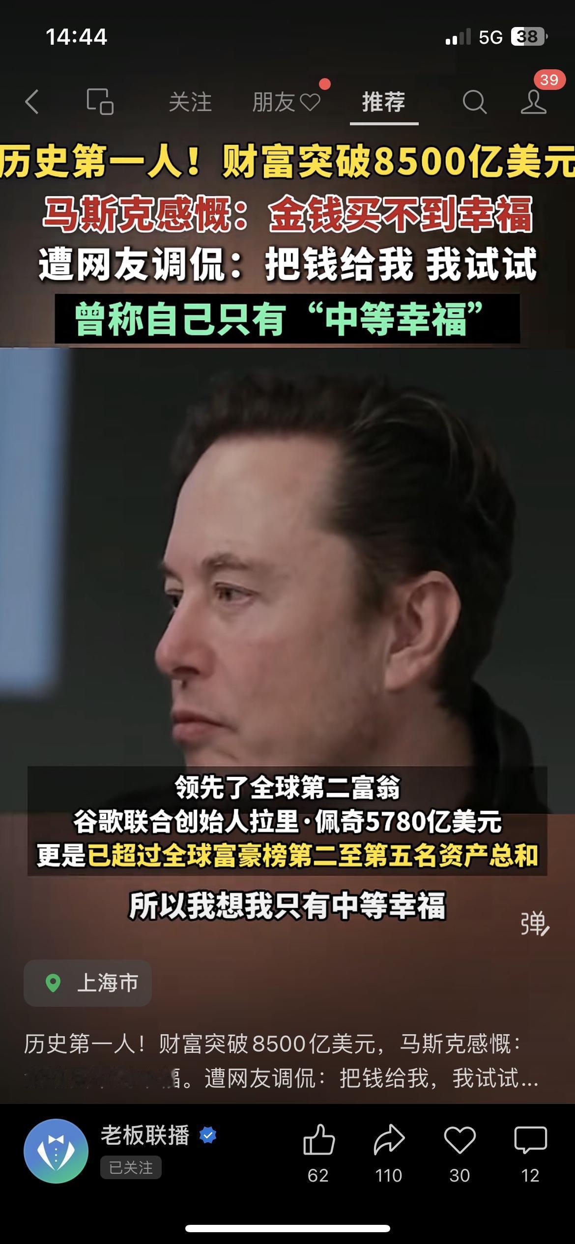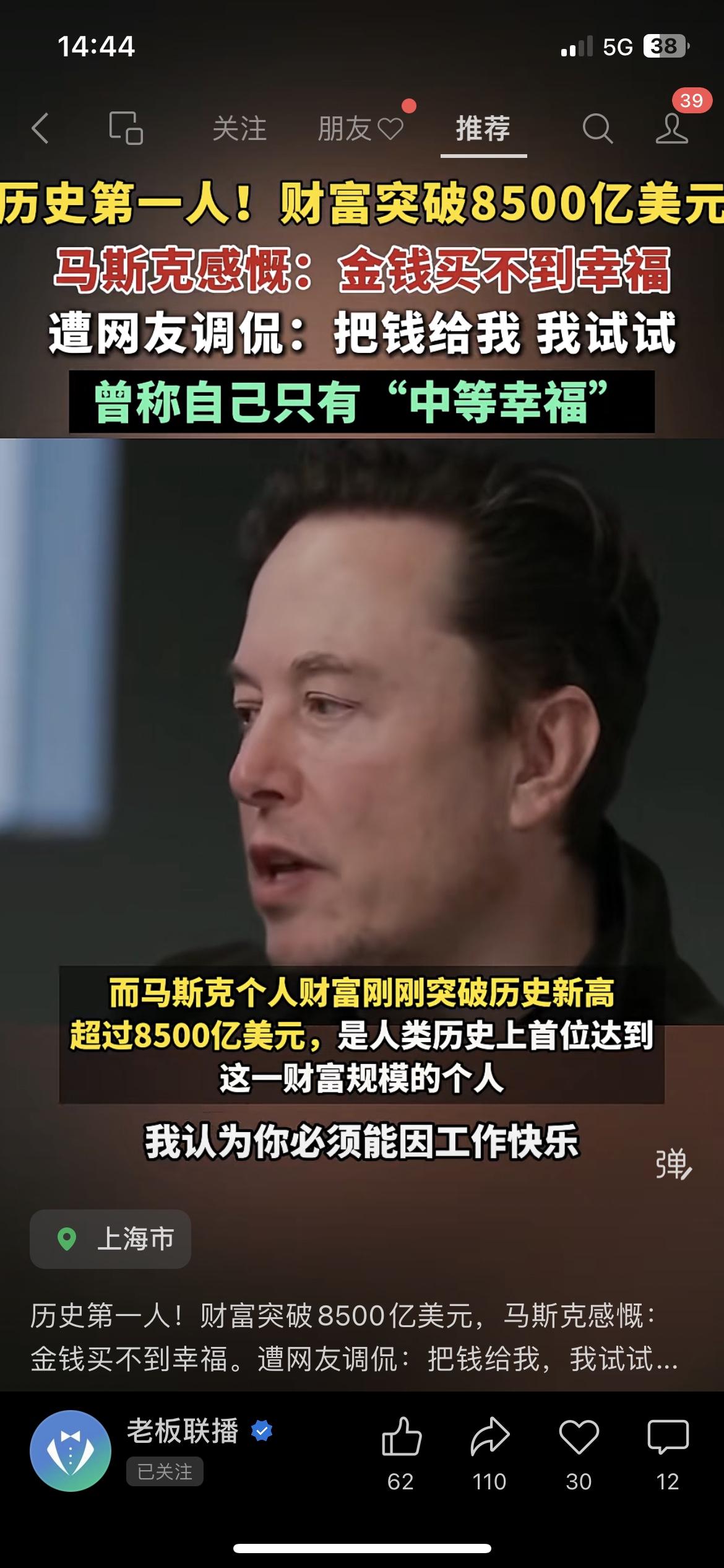 马斯克身家今天再破纪录!直冲8500亿,却说金钱买不到幸福? 全球首富再次刷新财富纪录,却坦言幸福感只是中等,网友评论直接扎心:先给我体验一下再下结论。其实对咱们普通人来说,安稳、健康、家人平安,就是最实在的幸福。幸福从来不是数字,是日子过得踏实。 你觉得多少钱能让你更有安全感? 马斯克 财富自由 财经热点