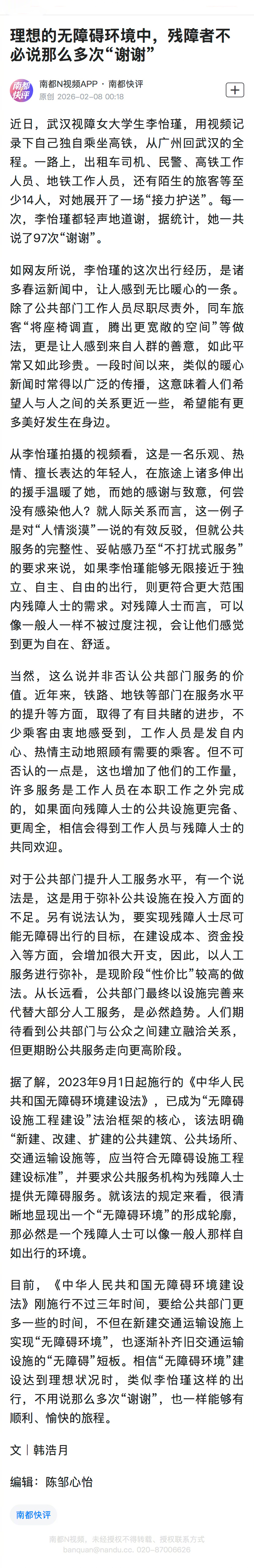 #理想的无障碍环境不需说太多谢谢#【南都快评:理想的无障碍环境中,残障者不必说那么多次“谢谢”】#从97声谢谢到真正无障碍出行#从李怡瑾拍摄的视频看,这是一名乐观、热情、擅长表达的年轻人,在旅途上诸多伸出的援手温暖了她,而她的感谢与致意,何尝没有感染他人?就人际关系而言,这一例子是对“人情淡漠”一说的有效反驳,但就公共服务的完整性、妥帖感乃至“不打扰式服务”的要求来说,如果李怡瑾能够无限接近于独立、自主、自由的出行,则更符合更大范围内残障人士的需求。对残障人士而言,可以像一般人一样不被过度注视,会让他们感觉到更为自在、舒适。