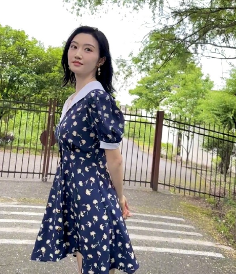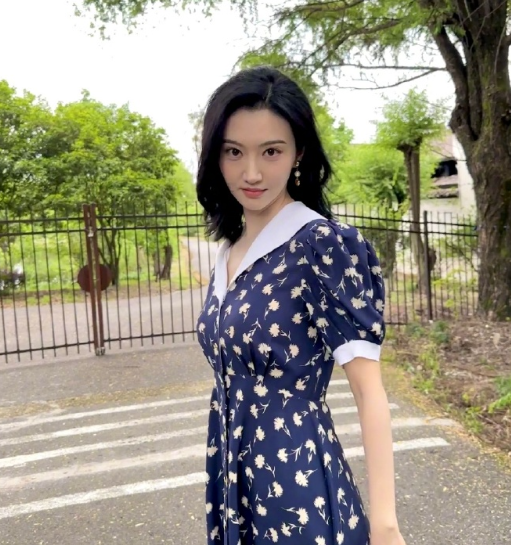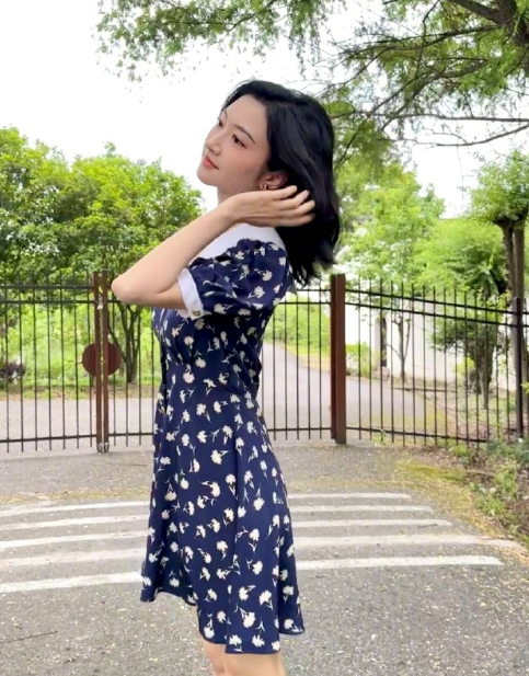 景甜晒户外随拍,着蓝色碎花裙少女感十足