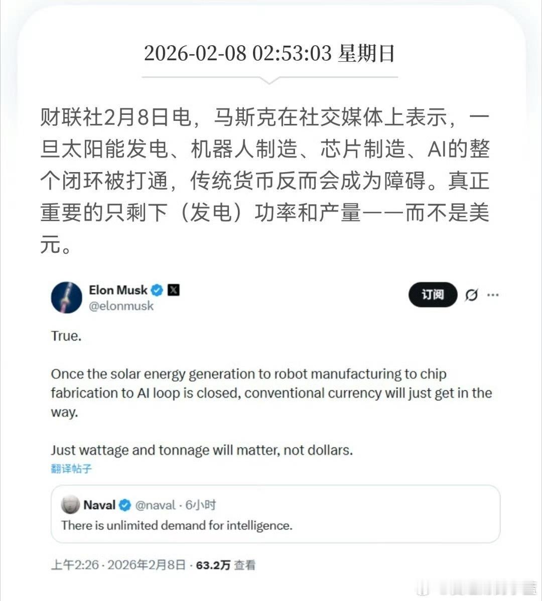 马斯克在社交媒体上表示,一旦太阳能发电、机器人制造、芯片制造、AI的整个闭环被打通,传统货币反而会成为障碍。真正重要的只剩下(发电)功率和产量——而不是美元。