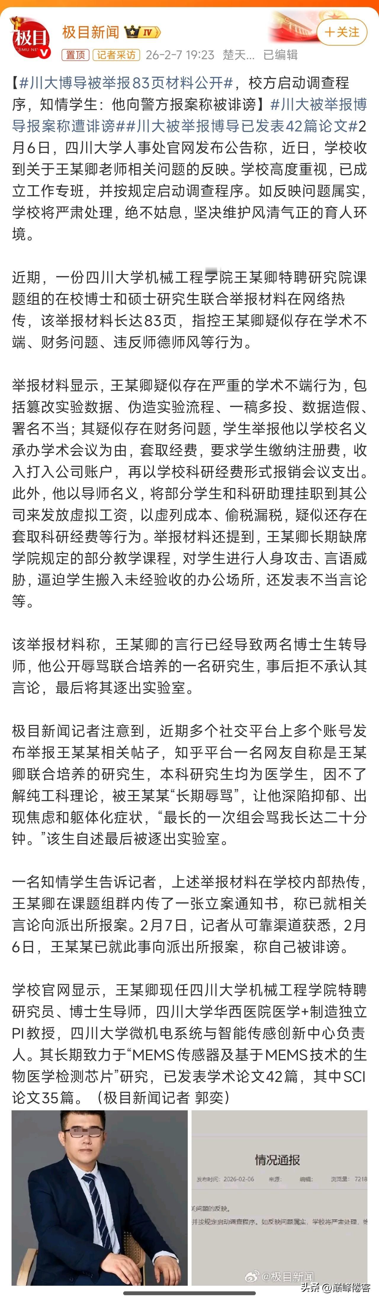 川大博导被举报83页材料公开,第一,看来这研究生被自己的“导师”逼到了死墙角,导师决定一个学生的未来,这个权力实在太大了。 第二,经常性听到或者看到,那些在导师手下当免费苦力的博士生、硕士生的故事,导师犹如他们的帝王一般。 第三,现在高校的这种导师决定学生学业“生死”的制度,要改变一下,这个堡垒太顽固了,甚至太反动了!