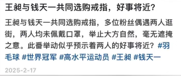 原来王昶的求婚戒指用心选了一年这颗心,专属于你!羽毛球世界冠军王昶公布领证求婚喜讯,直言求婚戒指选了很久代表“一颗真心只给你”。心形设计不仅少女心满满,更是藏满王昶一生爱一人的承诺。从并肩追梦到携手余生,国羽国乒冠军情侣的爱情,是细水长流更是一生坚定。