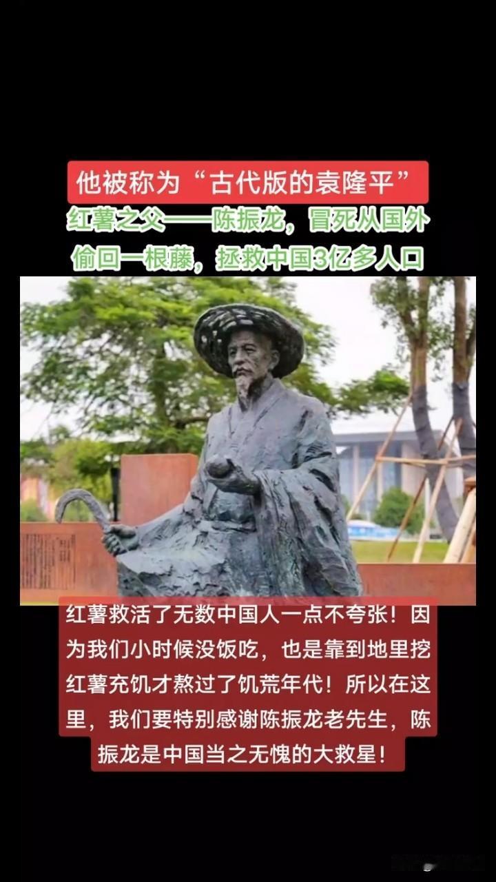 一根藤救4亿人!明朝书生冒死偷苗,如今吃红薯的人,却忘了他的名字 一根苗养活了4亿人,400多年前他从国外冒死带回,很多人却不认识一根苗挽救了粮荒,养活了4亿人! 400年前的明朝,福建碰上了大旱,粮食颗粒无收,无数百姓被饿肚子。 一个读书人冒死从国外带回来一根苗,奇迹般挽救了饥荒,帮助老百姓度过难关。 说出来你可能不敢信,这根救命苗就是咱们天天吃的番薯(红薯),这个敢拿命赌的读书人,叫陈振龙,福建长乐人,就是个没功名、没靠山的普通秀才,弃儒从商讨生活,却干了件改写中国粮食史的大事。 万历二十一年的福建大旱,绝不是轻描淡写的灾年。田土裂得能塞进拳头,稻禾全枯成干草,官府粮仓空得见底,老百姓只能啃树皮、挖观音土充饥,饿殍遍野是《福州府志》里明明白白的记载,那时候的人,真的是站在等死的边缘。 陈振龙当时在吕宋(今菲律宾)经商,当地被西班牙人殖民,番薯是他们严控的“战略作物”,明文禁令不许带出境外,敢私藏薯藤偷渡,抓住就是砍头,连坐家人都是常事。可他看着满地疯长、不挑水土、亩产顶水稻好几倍的番薯,心里揪得慌——老家乡亲在饿死,这东西就是能救命的根啊! 他没半点犹豫,花重金买下几尺薯藤,绞尽脑汁想了个九死一生的法子:把薯藤缠进浸透水的粗缆绳里,外面糊满烂泥,伪装成普通船用绳索,藏在商船底层。海上漂了整整七天七夜,他寸步不离守着缆绳,怕藤条失水枯死,怕西班牙兵登船搜查,每一刻都在鬼门关徘徊。 平安抵榕后,他第一时间在自家屋后开荒试种,当年就收获了饱满的薯块。紧接着,他带着薯种和种植技法,主动找到福建巡抚金学曾。金学曾深知闽地灾荒之苦,当即拍板全省推广,短短两三年,福建的饥民就有了口粮,绝境硬生生被盘活了。 这事远不止救了一时之急。番薯天生耐旱耐贫瘠,山坡、沙地、石缝都能扎根,亩产动辄数千斤,彻底补上了传统稻麦“靠天吃饭、产量有限”的短板。从福建到两广,再到江浙、中原、川蜀,陈振龙家族七代人接力推广种薯,把这根救命藤撒遍了全国。 史学界早有定论:明清两代中国人口从1亿出头,一路暴涨至道光年间的4亿,番薯、玉米等美洲高产作物是核心物质支撑,没有这根薯藤,传统农耕根本养不活如此庞大的人口。说它养活4亿人,不是夸张,是经得起史料推敲的历史事实。 最让人意难平的是,我们的历史总爱浓墨重彩写帝王权谋、战场杀伐,却极少提及陈振龙这样的普通人。他没有封侯拜相,没有青史留名的显赫头衔,只是凭着一腔乡土赤子心,用性命换来了万民温饱。如今街头巷尾的烤红薯香甜四溢,可十个人里有九个,不知道这口口粮的来历,更不知道那个冒死闯关的福建书生。 有人说,不就是带个植物吗?放在今天不值一提。可400多年前,那是跨国违禁、身家性命全押上的冒险,是放弃海外安稳生意、一心救乡邻的大义。真正的民族脊梁,从不是高居庙堂的权贵,而是这些默默为苍生谋活路的平凡人。 这根小小的薯藤,承载的是中国人的生存韧性,更是一个普通人的家国担当。这段救命史,不该被时间淹没,更不该被我们遗忘。 各位读者你们怎么看?欢迎在评论区讨论。
