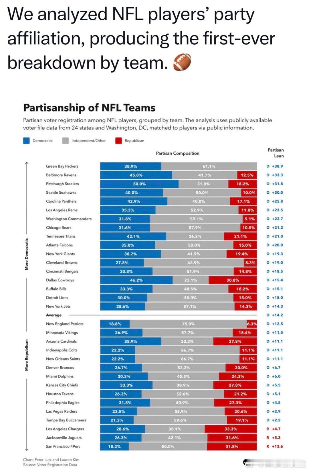 其他队都更倾民主党,比例最高的是绿湾包装工、巴尔的摩乌鸦、匹兹堡钢铁人、西雅图海鹰~这些队,注册民主党比注册共和党,都高出至少三十个百分点