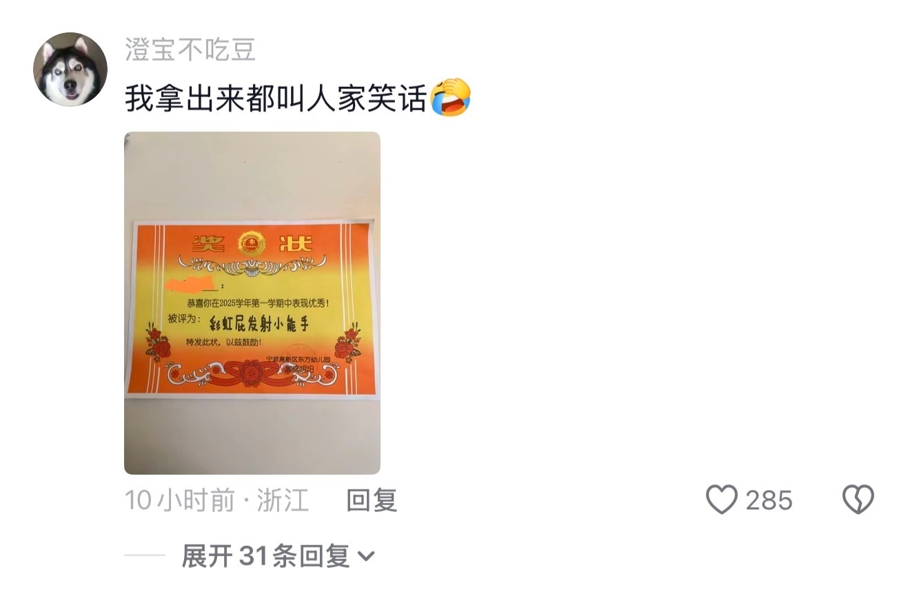 宁波小朋友获得彩虹屁发射小能手奖状 ,你小时候获得过什么奖状?有家长在网上秀自家孩子的“环保之星”奖状我刷到评论区竟然有个宁波家长发的奖状“彩虹屁发射小能手”这娃在幼儿园绝对给老师提供了无数情绪价值
