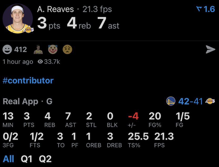上半场的里夫斯:5投1中 三分球2中0 罚球2中13分4篮板7助攻2抢断3失误勇士vs湖人