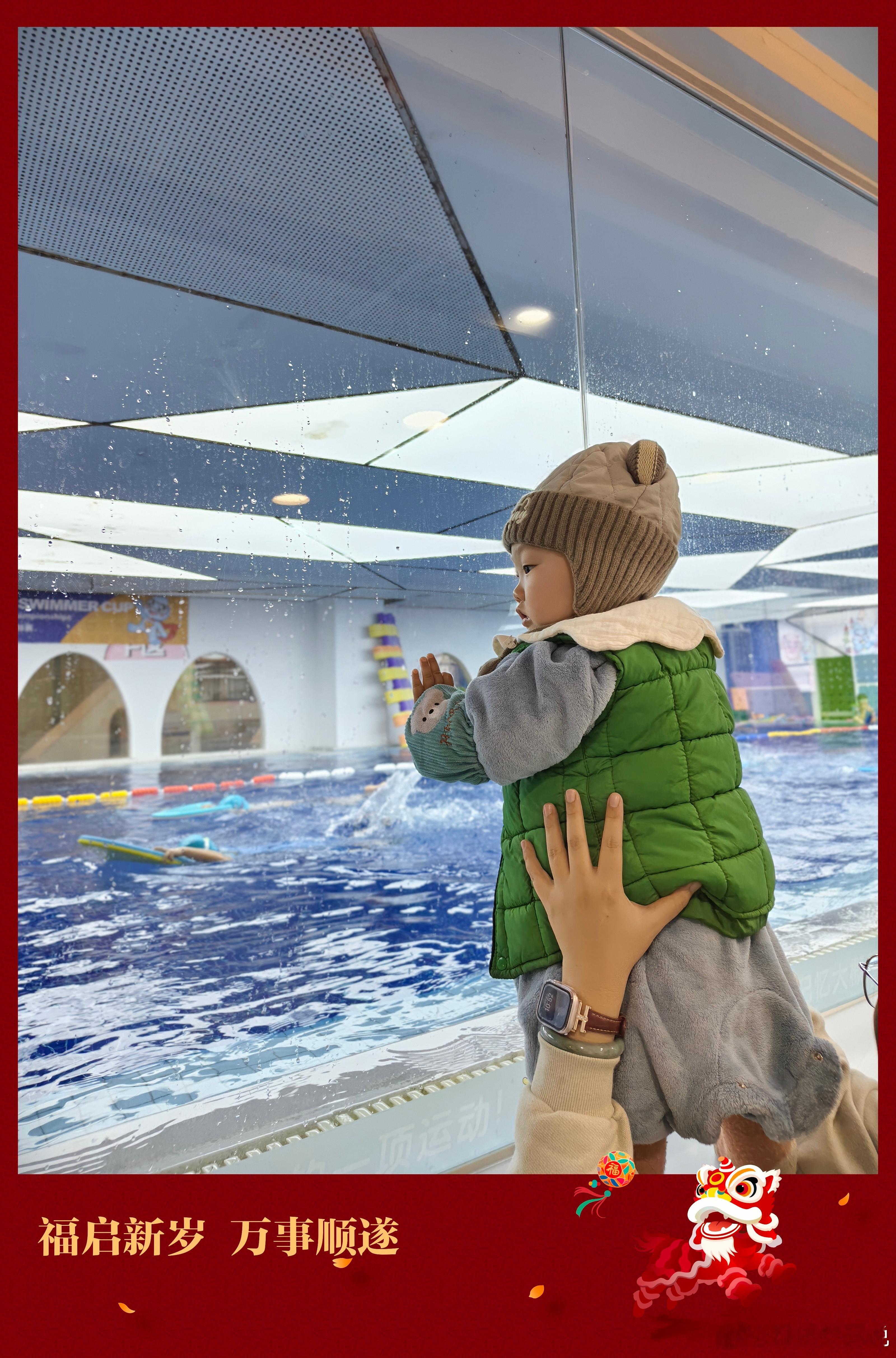 弟弟穿着哥哥以前的马甲来看哥哥游泳