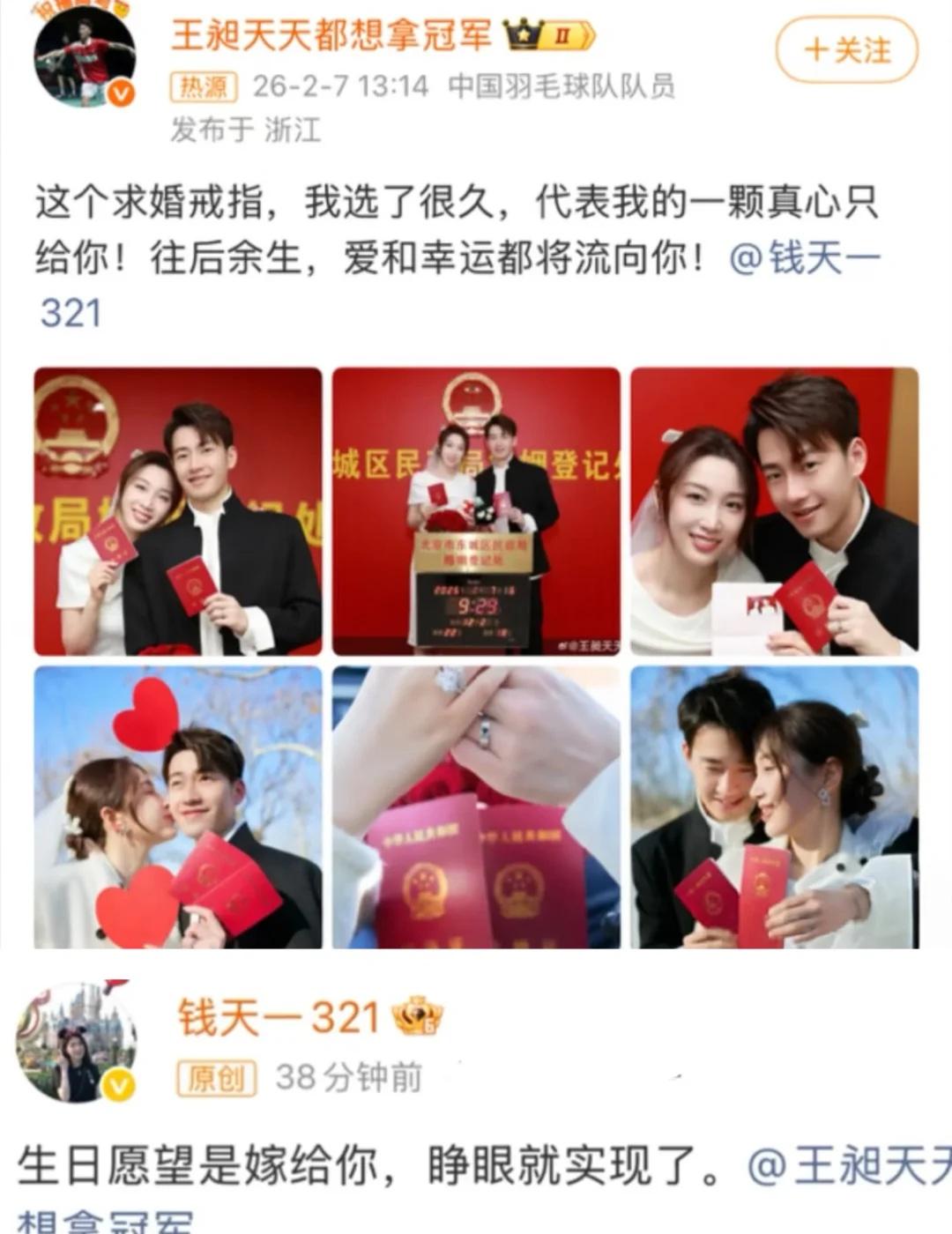 🏸帅哥王昶和🏓美女钱天一结婚啦❤️ 2月7日,羽毛球运动员王昶与乒乓球运动员钱天一官宣领证结婚🎀😍🎊 王昶发文:这个求婚戒指💍,我选了很久,代表我的一颗真心只给你!往后余生,爱💘和幸运🎉都将流向你! 真夫妻果然是最好磕的 领证 真夫妻就是好磕 领证仪式感 我们结婚了 王昶 钱天一 王昶钱天一结婚 王昶钱天一