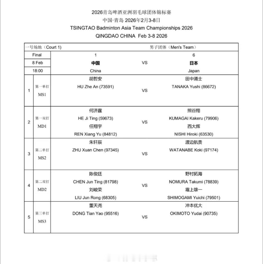 亚团赛男团决赛:中国vs日本对阵出炉今晚6点开赛2026年亚洲羽毛球团体锦