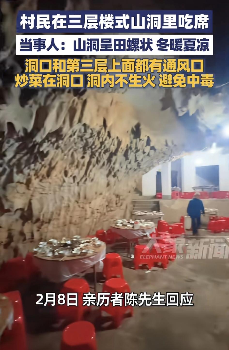 湖南永州一村民在3层楼式的山洞里。吃席的视频在网络上走红,村民介绍这个山洞呈田螺状,冬暖夏凉。在这里举办酒席,也吸引了很多的网友观看。大家最关心的就是安全隐患的问题,因为这个山洞在顶层和洞口都有通风口,炒菜都是在洞口完成,所以可以很好的避免安全隐患和中毒的风险。网友说,住在这里,真的是省去建房子的钱,同时还可以在网络上分享更多有趣的生活日常。