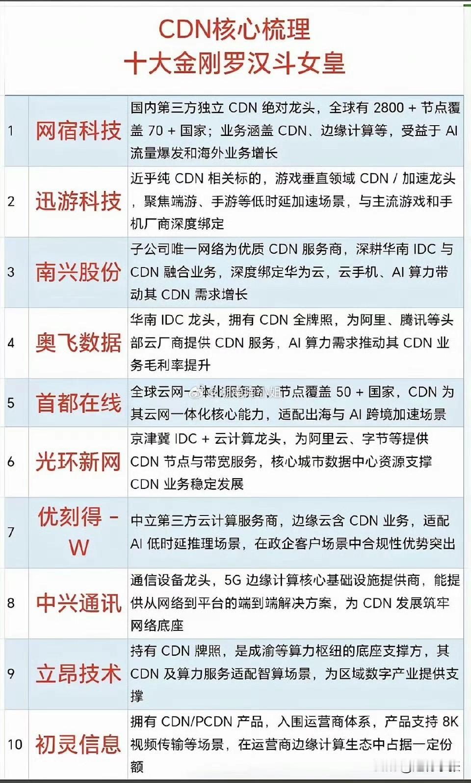CDN 概念(Content Delivery Network,内容分发网络)。 深挖CDN赛道的“十大金刚”!随着AI大模型和8K视频的爆发式增长,对内容分发和低时延的需求正成为新基建的关键战场。 这份名单梳理了网宿科技、迅游科技等核心企业,从第三方龙头到垂直领域专家,从出海服务到算力底座,每一家都在各自的领域里卡位布局。 无论是游戏加速、AI算力支撑,还是运营商生态,这些公司正借势CDN和边缘计算的东风,成为数字经济高速路上的隐形基建。 关注这条主线,抓住AI浪潮下的硬核投资机会!