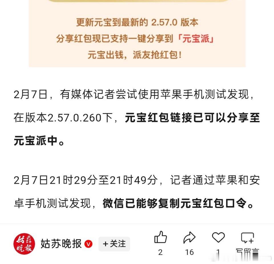 元宝派支持一键分享红包 2月7日晚,腾讯元宝宣布完成版本更新。用户在升级至2.57.0版本后,可将红包一键分享至“元宝派”,进一步拓展互动场景,方便用户跨平台分享与领取。元宝派成红包分享新入口