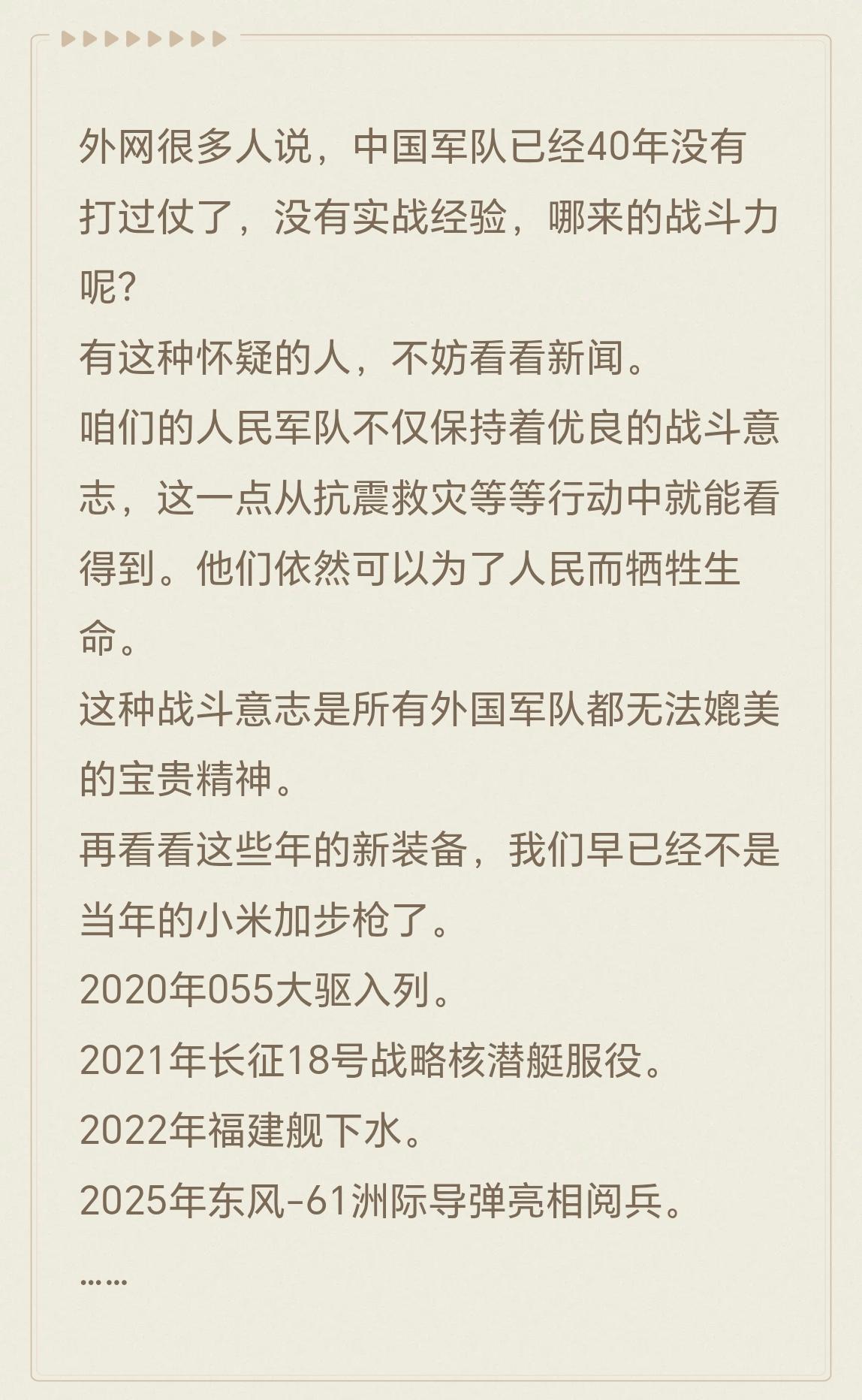 外网很多人说,中国军队已经40年没有打过仗了,没有实战经验,哪来的战斗力呢? 有这种怀疑的人,不妨看看新闻。 咱们的人民军队不仅保持着优良的战斗意志,这一点从抗震救灾等等行动中就能看得到。他们依然可以为了人民而牺牲生命。 这种战斗意志是所有外国军队都无法媲美的宝贵精神。 再看看这些年的新装备,我们早已经不是当年的小米加步枪了。 2020年055大驱入列。 2021年长征18号战略核潜艇服役。 2022年福建舰下水。 2025年东风-61洲际导弹亮相阅兵。 ……