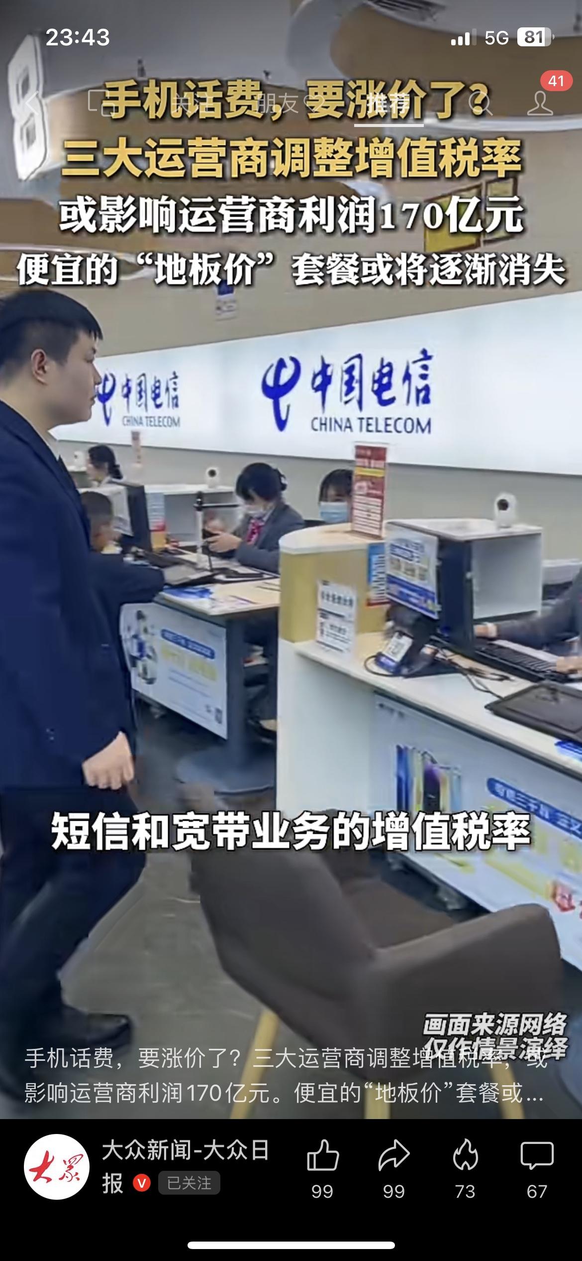 运营商税率调整,低价套餐真的要变少了! 三大运营商税率调整后行业利润承压,未来超低价“地板套餐”大概率逐步减少。不会直接大幅涨价,但优惠收缩、门槛提高会很明显,老套餐且用且珍惜。 优惠悄悄缩,比直接涨价更让人没察觉。 你会为了保低价套餐,提前锁定或换运营商吗? 手机套餐 通信资费 民生消费