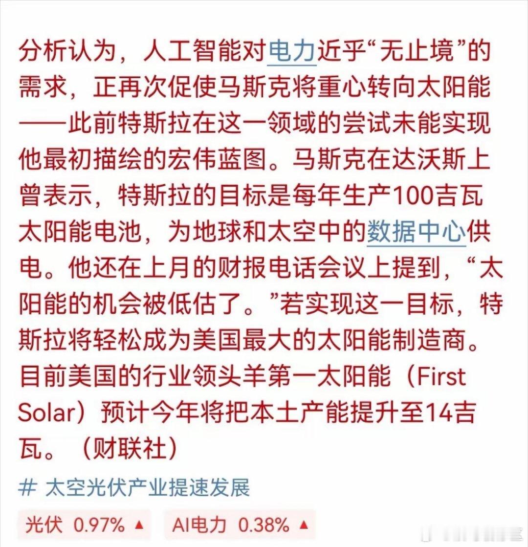“太空光伏”的消息突然变了颜色,据称特斯拉正在美多州布局建造太阳能电池厂。这个消息对于一心想着榜上“太空光伏”这个便当饭炒作自家股票的,这下该安静了。如果情况是属实,那么上周一直传言马斯克团队调研我们的光伏企业的消息,大概率是来看光伏原材料和光伏设备的。而不是来寻求共同合作制造太空光伏的。一旦马斯克自己在美国搞,产能直接都去美国了,对于我们的企业来说绝对也不是什么好事。此消息下周会不会对光伏板块形成“扰动”呢,我们拭目以待!