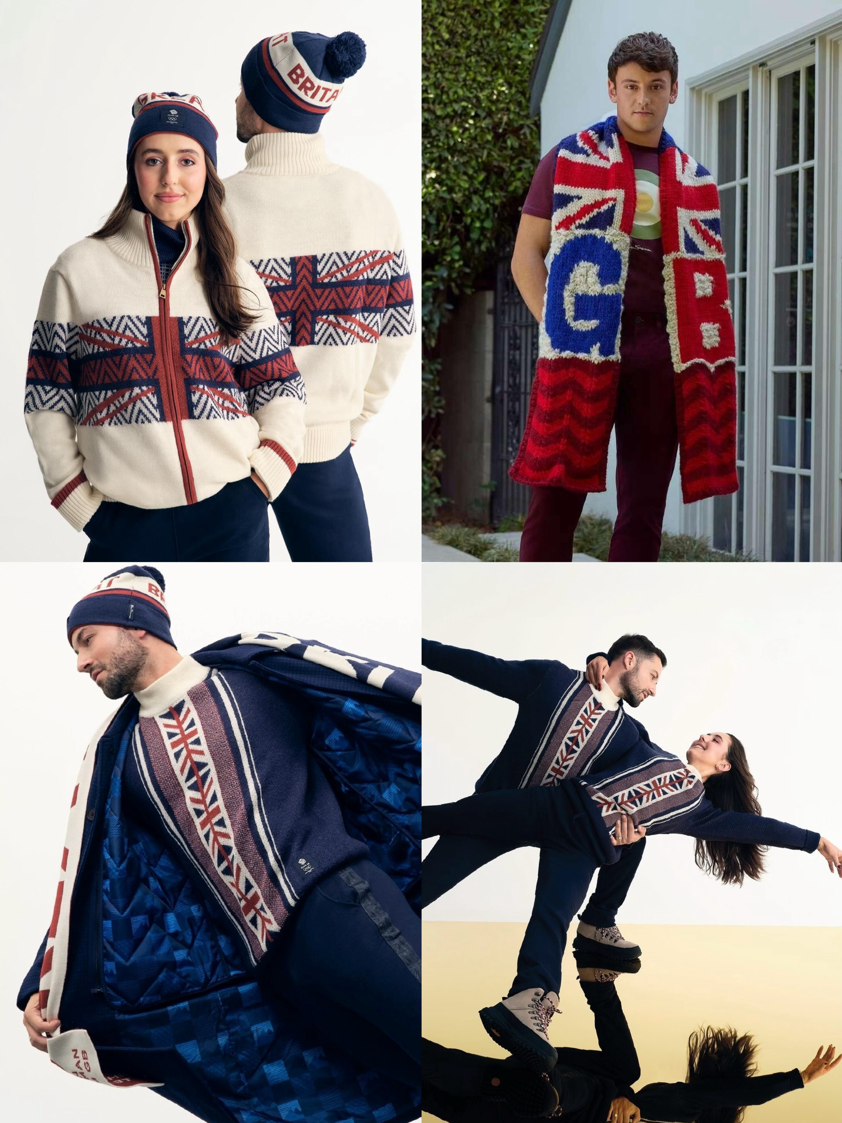🇬🇧英国队战袍由本土品牌Ben Sherman打造,更有奥运冠军汤姆·戴利亲自参与设计。融合了英式剪裁和现代风格,图案灵感源自多洛米蒂山脉,羊毛犬牙纹大衣版型挺括,混纺高领毛衣温暖百搭,最出圈的当属戴利手工编织的围巾与冬帽,软糯质感搭配精致纹路,英伦学院风拉满,细节处尽显英式精致,保暖又养眼。