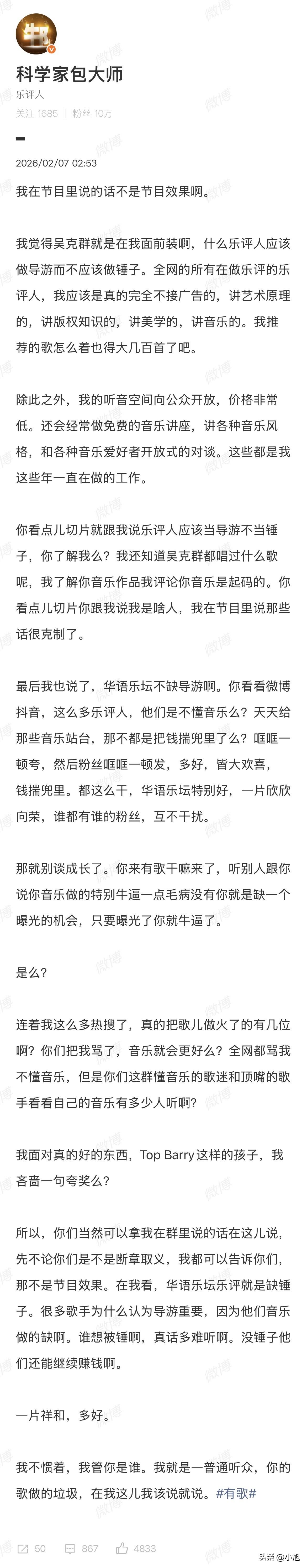 梁源因不满吴克群在音乐综艺《有歌第二季》中对其乐评人角色的批评,于2026年2月7日起连发多条微博直指对方“装”,引发双方支持者激烈争论,事件核心围绕乐评边界、沟通方式及行业生态展开。 而央视新闻马上发了吴克群帮农民卖掉3万斤菜,为他点赞! 这算是力挺吴克群吗?