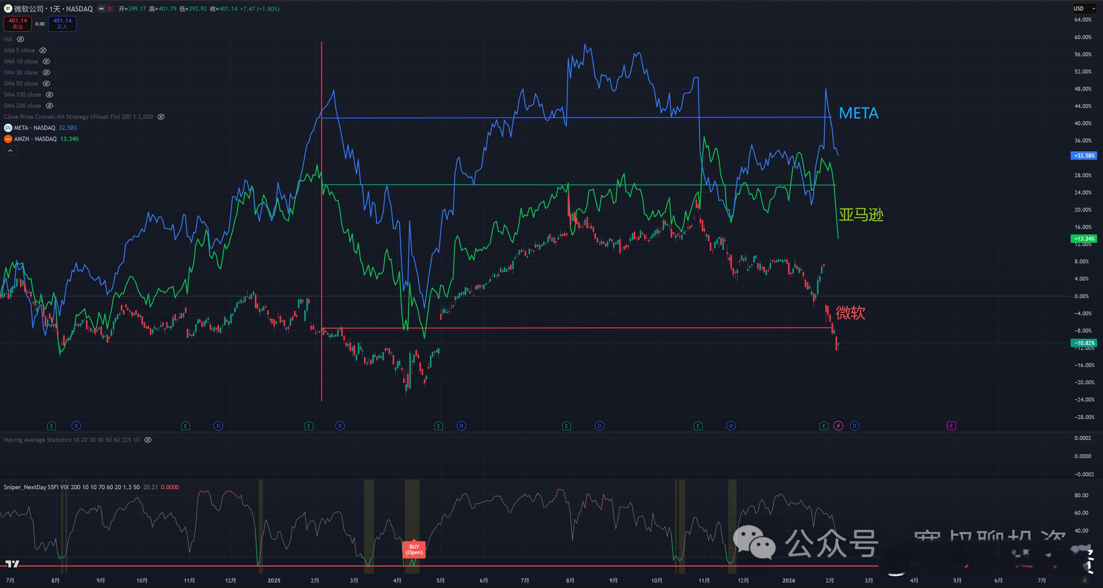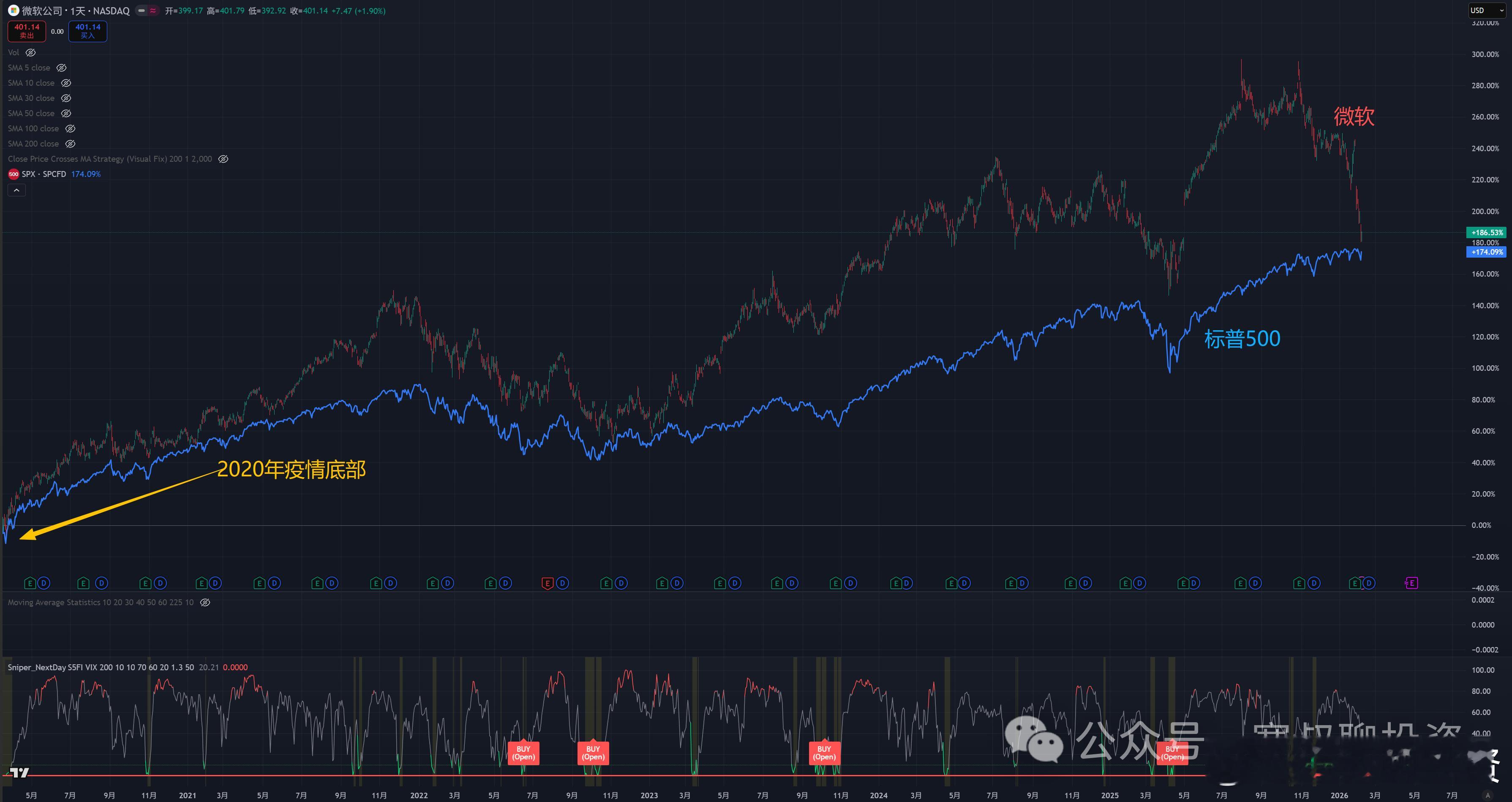事实给出了一个冷酷的答案。下图是标普 500 指数(蓝线)与微软(K 线)自 2020 年疫情以来的走势,我们可以看出:微软曾凭借 AI 浪潮积攒下的巨大领先优势,目前已基本被抹平(图1):