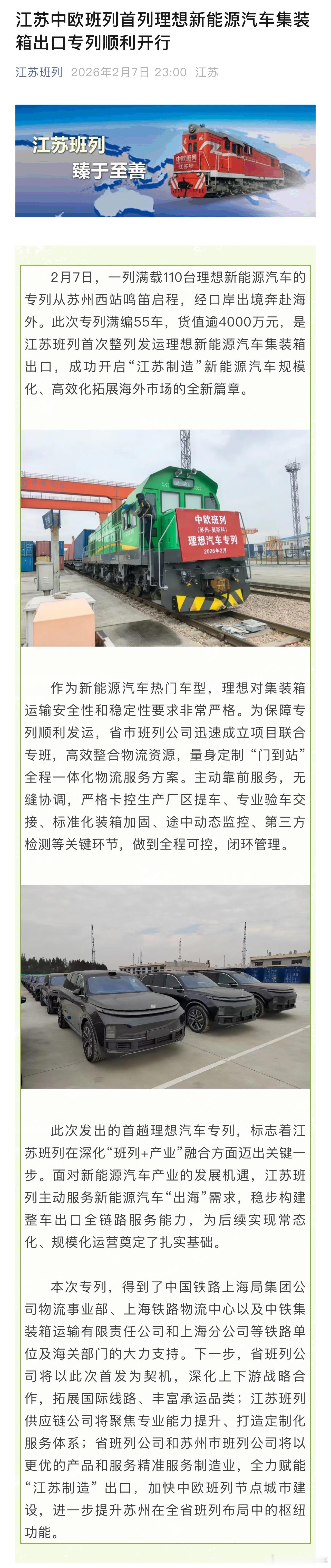 江苏制造、中欧专列、理想汽车专列,110 台理想汽车通过铁路发运海外,看起来此次目的地应该就是莫斯科,此前是与国机股份合作进入俄罗斯,首批销售车型为理想 L6、L7、L9。理想汽车新能源汽车