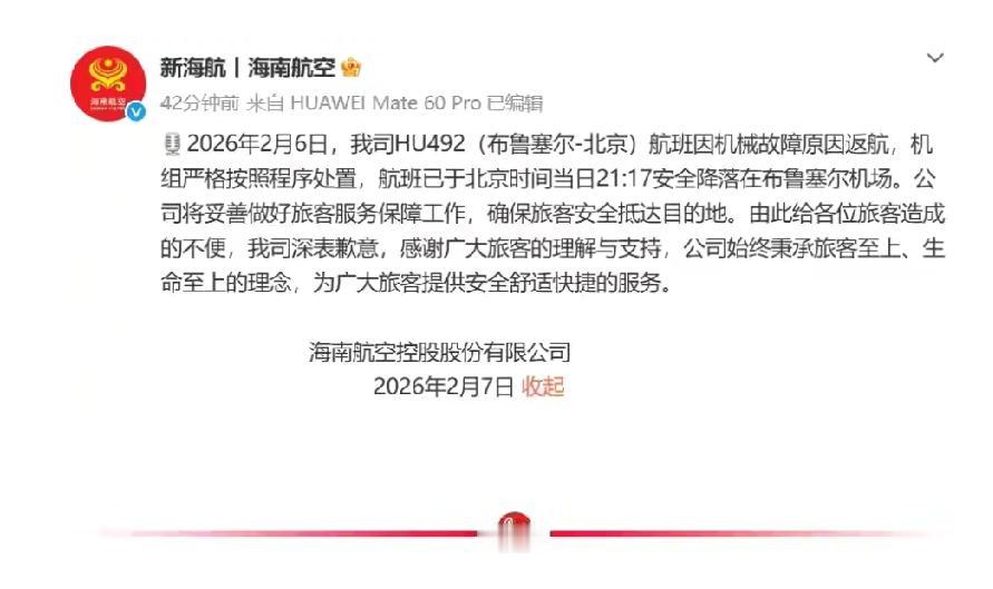 2月6日,海航HU492这趟从布鲁塞尔飞往北京的航班可真是让人捏把汗。这是架波音787 - 9宽体机,机龄7.1年,原计划飞约7945千米到北京首都机场T2。 起飞没多久,驾驶舱风挡破裂,这情况太吓人。好在机组专业,果断按程序操作,先空中放油减轻重量,然后平安返航布鲁塞尔机场。航班取消,但旅客和机组都没事。 2月7日海航微博致歉,还会做好旅客保障,提供免费改签、全额退票等服务。虽说最后有惊无险,但这挡风玻璃破裂的问题也得好好查查,给大家一个安心的交代。