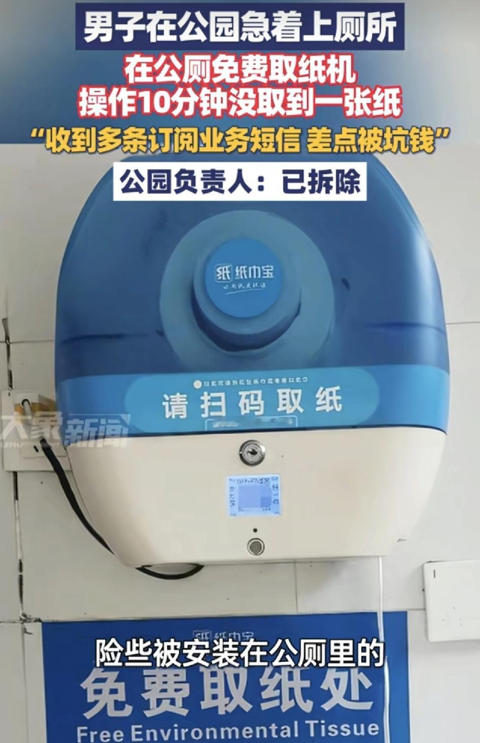 广西柳州一男子在公园游玩时,差点被免费取纸机坑了钱,这台机是在厕所里放着,标注着可以免费取子,但是男子操作了10分钟没有取出一张纸,本以为是免费取痣,但是操作之后就需要输入验证码,如果急着用纸,就很有可能是订阅业务成功。公园负责人表示,之前为了方便市民用纸,同意运营方安装设备。至于后面的付费项目应该是后续运营方添加进去的。全国公厕看深圳,深圳的市民都反映城市里的公园绝对配备着免费纸巾。