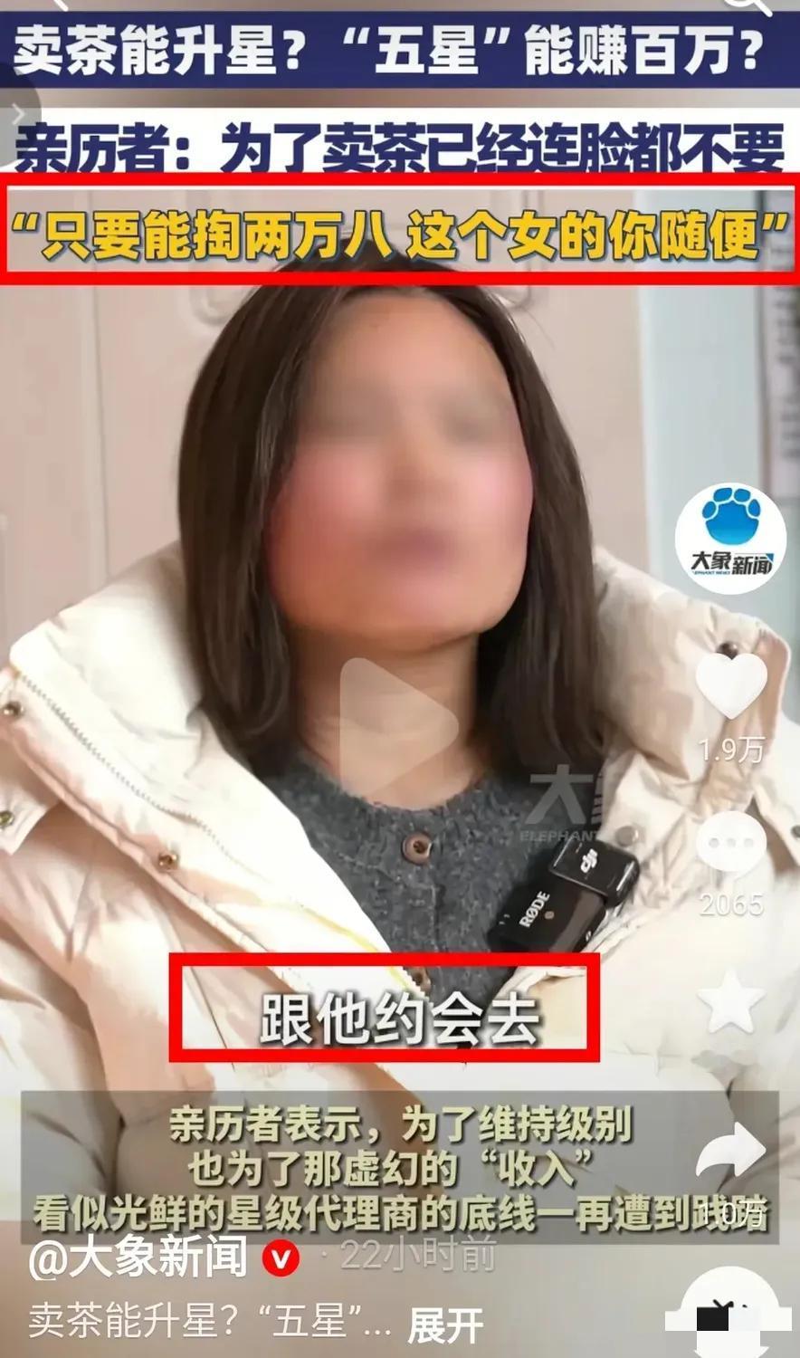“只要能掏2万8,这个女的你随便”,原来为了卖黑茶,女代理被逼的脸都不要了。 为了实现年入百万的女强人梦,女子花了大钱买茶,公司的老师还一天天用话术洗脑,让女子打电话给丈夫支持自己,让男方的七大姑八大姨全都来买黑茶。 视频里的女子讲述当时也是一心想赚钱,听别人说做黑茶能年入百万,能当女强人,脑子一热就交了2万8进去。进去之后才发现,一切都和当初说的完全不一样,每天就是被各种老师轮番洗脑,耳边全是暴富的话术,听得人越来越糊涂,越来越偏执。 只要家里老公不支持、不掏钱、不跟着一起做,里面的人就不停挑拨,专门教她怎么跟老公对着干,甚至直接劝她离婚,说老公是拖后腿的,是拦着她发财的。圈子里几乎都是这样,十个做黑茶的,九个最后都离了婚,家庭全散了。 为了完成所谓的业绩,她被逼着去联系所有亲戚,把老公这边的七大姑八大姨全都挨个劝一遍,让大家都来买茶、都来投钱。很多人本来不愿意,被她缠得没办法,最后不仅没赚到钱,还把所有亲戚都得罪完了,走到哪都被人躲着。 等到她彻底反应过来的时候,已经晚了。钱投进去打了水漂,茶卖不出去,家人不理解,亲戚都疏远,最后她也和老公离了婚,一个人孤孤单单,想回头都不知道往哪走。 她坦言,那段时间整个人都被洗得不正常了,满脑子都是拉人头、冲业绩,完全失去了正常判断。现在清醒过来,只剩下无尽的后悔,每天都很迷茫,不知道接下来的日子该怎么过,也不知道怎么去弥补被自己伤害过的家人。 这种打着创业、卖茶旗号的骗局,根本不是什么商机,就是一步步把人往火坑里推,先骗钱,再毁家庭,最后让人众叛亲离、走投无路。 各位读者你们怎么看?欢迎在评论区讨论。