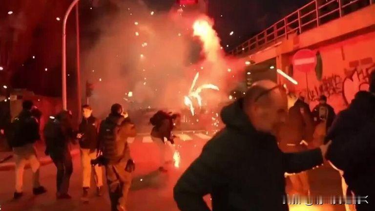 意大利警方在奥运场馆附近向抗议者发射催泪瓦斯 据估计,周六——即冬季奥运会首个完整举办日——约有1万人走上米兰街头,举行大规模示威,抗议住房成本以及奥运会对环境造成的影响。 意大利警方向抗议者发射了催泪瓦斯和水炮,这些抗议者在冬奥会场馆附近向警方投掷鞭炮、烟雾弹和瓶子。 身穿防暴装备、手持盾牌的警员与约100名抗议者对峙。其中一些抗议者戴着帽子和围巾遮住面部,此前他们脱离了主示威队伍,似乎正试图前往桑塔朱利亚奥林匹克冰球馆。 一群抗议者还在距离奥运村约半英里(800米)的地方燃放了烟雾弹和鞭炮,约1500名运动员正住在奥运村。 Image:烟花在靠近桑塔朱利亚场馆、用于对抗抗议者的警用水炮附近爆炸。图片:路透社 Image:烟花在警察头顶的天空中绽放。图片:路透社 据警方消息,六人在冲突中被捕。 据估计,周六——即冬季奥运会首日的完整一天——有约一万人走上米兰街头,举行大规模示威活动,抗议本届奥运会对环境、经济和社会造成的负面影响。 阅读更多:关注意大利冬奥会的最新动态 Image:抗议者与警方发生冲突,分裂的抗议活动演变为暴力。图片:美联社 Image:抗议者躲避,警方向他们喷射水炮。 奥运基础设施项目遭批评 此次游行由基层工会、住房权益团体以及社区活动中心的社区活动人士组织。 抗议者们手持树木的纸板剪影,以象征为在科尔蒂纳举办奥运会而修建的新雪车赛道所砍伐的树木。他们认为,像这样的基础设施项目已对山区社区的环境造成了破坏。 Image:抗议者手持树木的纸板剪影。 Image:抗议者在一场反对奥运会环境影响的抗议活动中手持烟雾弹。图片:路透社 “他们绕过了重大基础设施项目通常需要遵守的法律,理由是奥运会迫在眉睫,”一名抗议者表示,并补充道,他担心负责组织此次活动的私营公司最终会将债务转嫁给意大利纳税人。 国际奥委会认为,本届奥运会主要利用现有设施,使其更具可持续性。