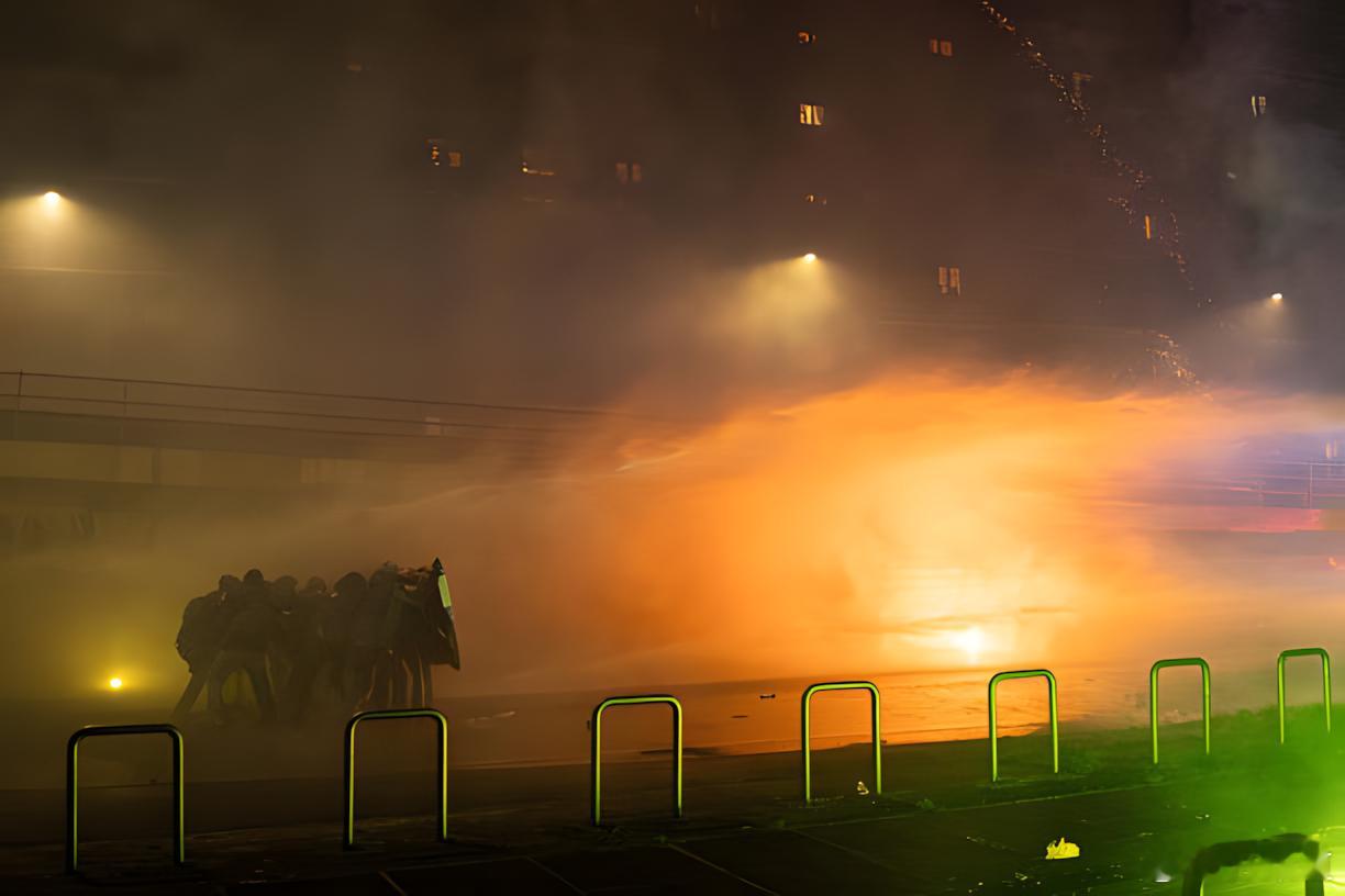 约100名脱离示威主队伍的参与者向警察投掷了烟花、烟雾弹和瓶子。全副武装的防暴警察随即动用水炮进行驱散。冲突在数分钟后平息,据警方消息人士透露,共有6人被带走。