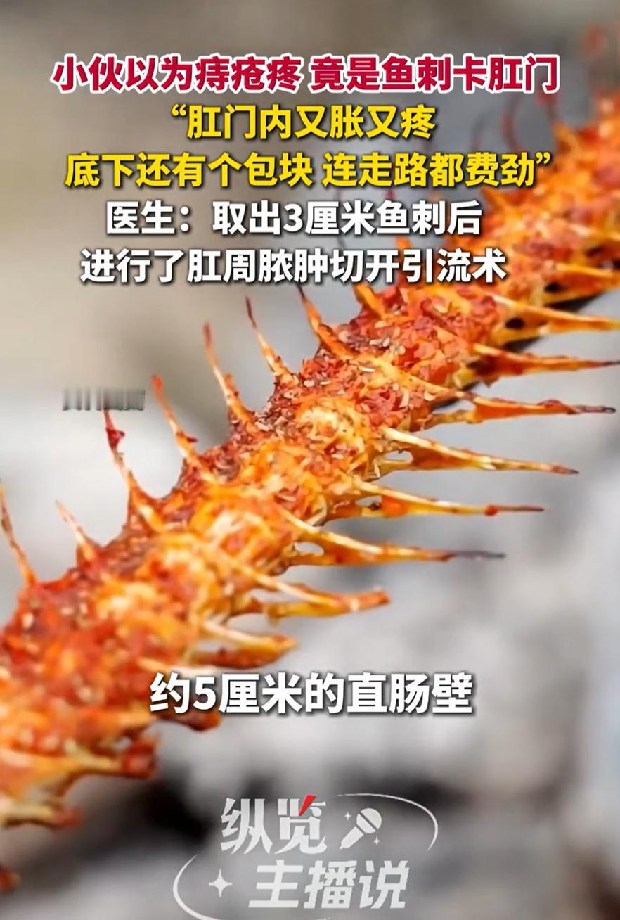 “听着都疼!”广东,一男子发现自己的屁股又胀又疼,开始还以为是痔疮犯了,过几天就好了,可问题越来越严重,去医院检查才知道,竟然是鱼刺卡在了肛门上,而医生手术后取出了一个3cm的鱼刺,网友:消化不掉? 男子今年28岁,一开始发现不舒服,还以为是上火长了痔疮,可随着时间推移,情况却越来越严重,而且摸着还长了一个包块,连走路都费劲,于是赶紧去医院检查 医生一检查,结果出人意料,哪是什么痔疮,竟是一根鱼刺扎在了离肛门约5厘米的直肠壁上,足足有三厘米长。手术取出来后,还顺带处理了已经形成的肛周脓肿 很多人想不通:鱼刺吃下去,到胃里不就该被消化了吗?怎么还能一路跑到肠子末端,还扎进了肉里? 其实,胃酸确实能软化很多东西,但并非万能。尤其是一些坚硬、细长、尖锐的物体,比如鱼刺、鸡骨,如果形状特殊,就有可能躲过胃酸的“融化”,顺利进入肠道 肠道不像食道或胃壁那么坚韧,它很柔软,会不断蠕动。尖锐的物体在蠕动过程中,很容易扎进肠壁。如果卡的位置靠下,靠近直肠肛门,就会让人误以为是痔疮发作 我觉得,这个事也是一个提醒,吃饭真的要专心,特别是吃带刺带骨的东西,别边说笑边吃,细嚼慢咽不是老生常谈,是常识问题。一旦感觉吞了硬物,别迷信喝醋、吞饭团这些土方法,很可能让刺扎得更深,及时就医才最稳妥