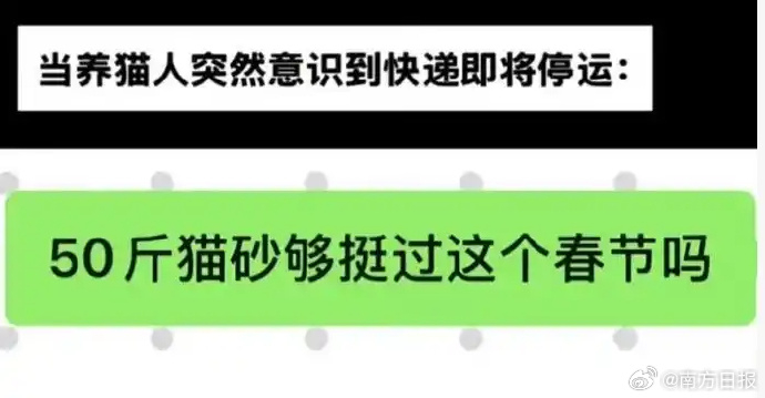 #春节期间还能收到快递吗#【#一句快递停运网友连下20单#】临近春节,不少朋友开始陆陆续续囤一些年货,每年一问又来了,快递春节停运吗?近日,“快递停运”冲上微博热搜。这一消息引发网友热议,不少人表示有点“焦虑”,有网友表示“一句停运,连夜下了20单”。难道快递真的要停运?对此,多家快递企业相继发布春节期间服务安排,宣布将继续提供收派服务,全力满足节日期间的寄递需求。圆通速递、申通快递、韵达快递客服均表示,春节期间快递不停,且未收到加价通知。中国邮政速递物流客服表示,快递运送全年无休,但有可能会出现上门取件加价情况,具体规定需看后续通知。中通快递客服称,目前暂未接到停运通知。另外,正常情况下,春节期间不会收取资源调节费。京东物流则回应,根据春节期间快递流量情况,部分站点可能会出现排班情况,且会产生资源调度费,具体以站点为准。此外,顺丰速运、德邦快递客服均回复春节期间不停运,但运输费用会有调整。同时,快递企业提醒:因节日期间资源调配受限、极端天气变化等多重因素,快件时效或将受到不同程度影响。(南方日报)