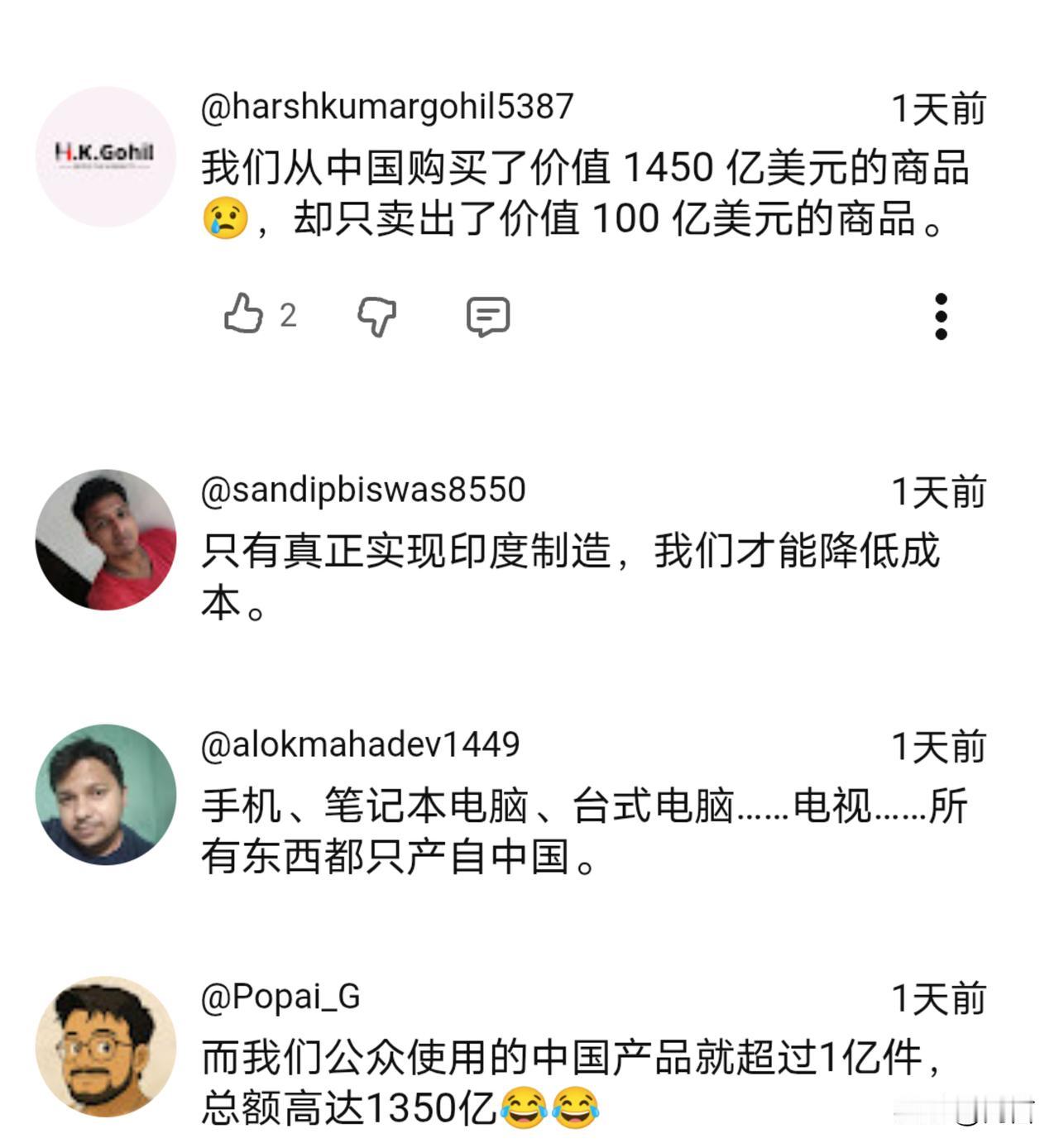 印度网友破防!知道中国是顺差,但没有想到悬殊会这么大。 据印媒2月7日报道,2025年,中印双边贸易额达到了1556亿美元,同比增长超过12%。其中,中国对印度出口额约为1358.7亿美元,自印度进口额约为197.5亿美元,贸易顺达到了1161.2亿美元。 两国的差距不止是体现在数据上,同样体现在结构上。2025年,中国对印度出口主要集中在机电产品、化工原料和金属制品这三大领域,其中机电产品占比超过一半。而印度对对我国的出口产品则为,原材料(能源、矿产)和低附加值代工品(电子零部件)为主。 闻讯后的印度网友不淡定了,他们认为“印度制造”取得了长足进步,已经初步俱备了与其他制造业强国竞争的实力。然而,让他们没有想到的是,差距不仅没有缩小,反而在不断拉…
