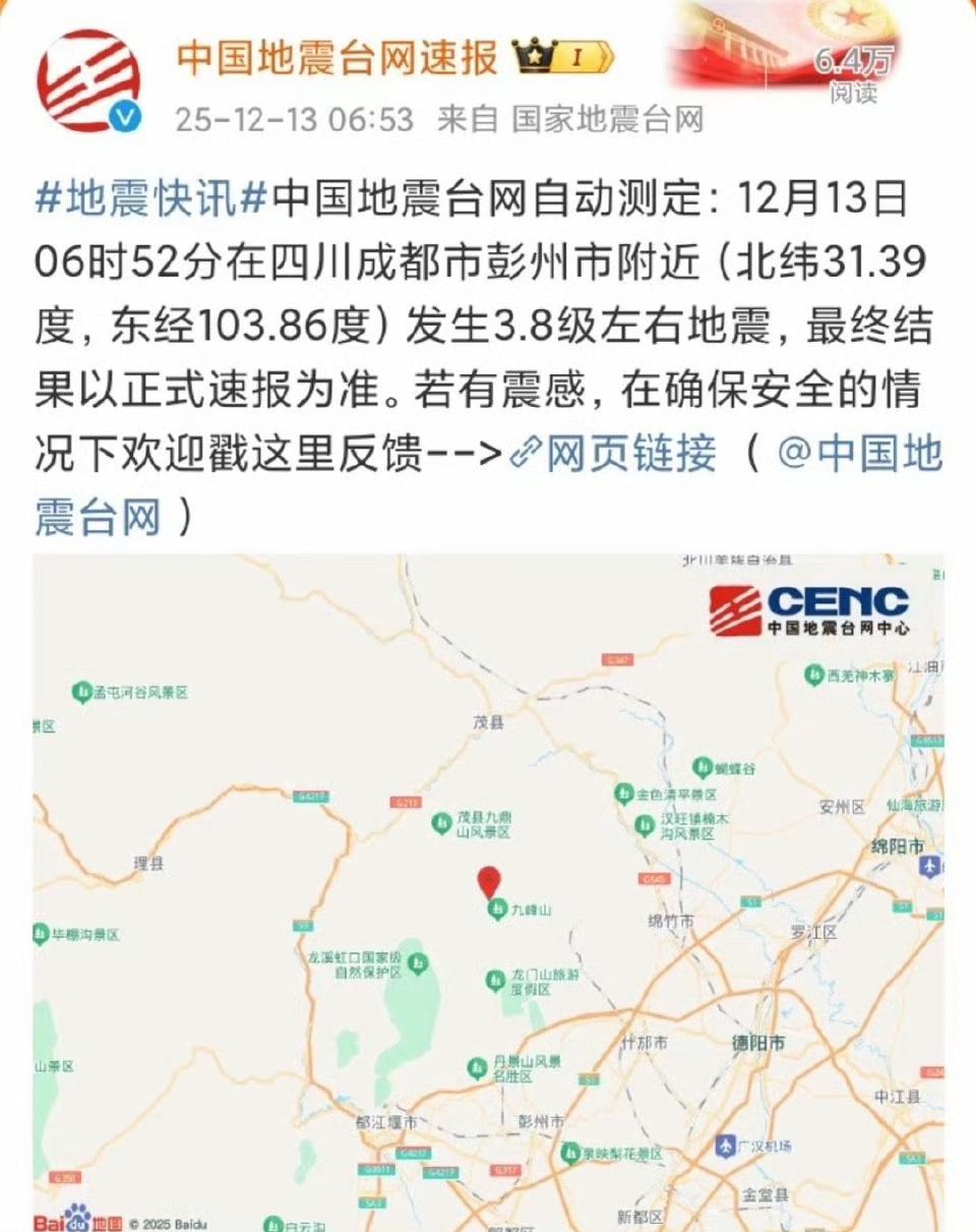 四川泸定3.8级地震!成都多地震感明显,万幸暂无伤亡 四川的朋友今天又体验了一把“地动山摇”!2月8日14时06分,甘孜泸定县突发3.8级地震,震源深度10千米,官方通报目前暂无人员伤亡和财产损失,悬着的心总算放下了❤️ 这次地震存在感可不低,不仅泸定当地震感强烈,就连200多公里外的成都,眉山、乐山、资阳等多地网友都直呼感受到摇晃,有网友说桌子电脑晃个不停,高层住户体感更明显,还有人刚感觉到晃动,手机就收到了地震预警,这53秒的安全感太重要了! 值得一提的是,这次震中距2022年泸定6.8级地震震中仅13公里,不少四川网友感慨“老熟人了”,但也都淡定表示“小震不用慌,大震跑不了”,川人的乐观刻进DNA了!而且今天绵阳北川还刚发生了3.3级地震,四川地震局也在及时摸排,为工作人员的速度点赞! 虽然是小震,但防灾意识可不能少,手机地震预警开了吗?应急包备好了吗?这些小细节关键时候能救命! 问问四川的老乡们,今天你感受到震感了吗?当时第一反应是啥?评论区聊聊你的地震瞬间,顺便分享下你的防震小妙招~ 四川泸定地震 成都震感