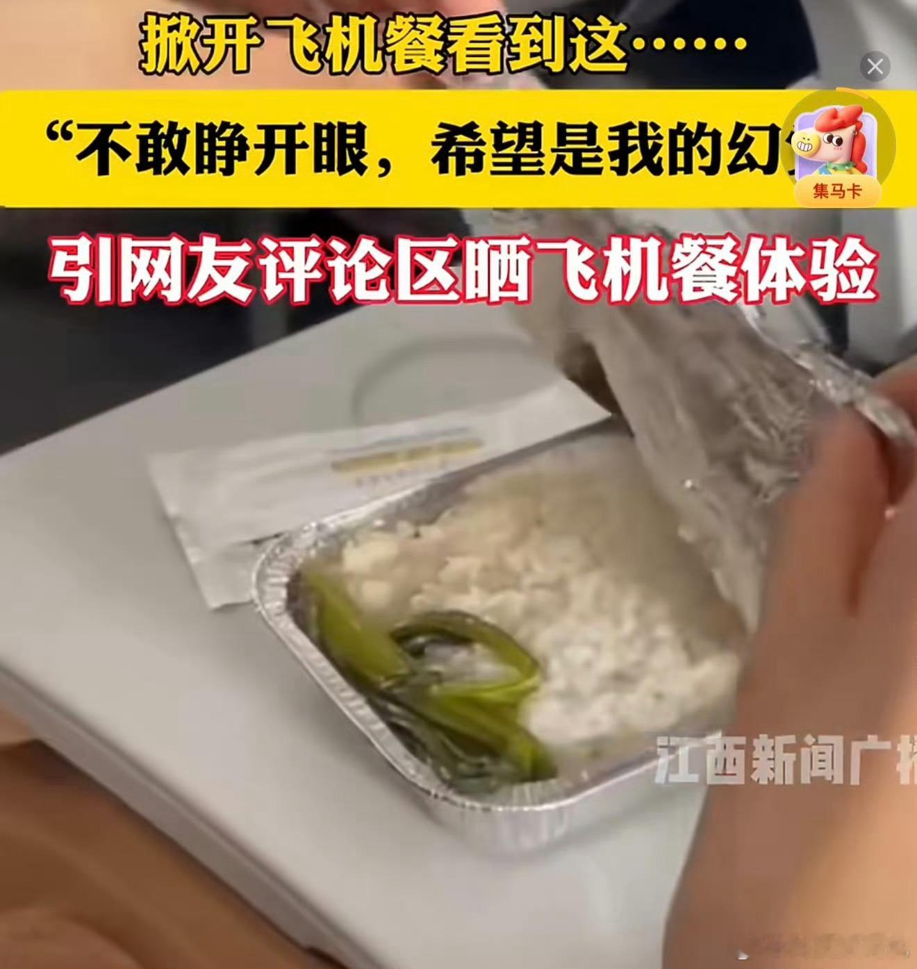 女子吐槽飞机餐仅一根青菜配米饭这应该是出问题了我每年飞得还挺多的飞机餐饭一般都是素荤搭配的好吃肯定谈不上,份量也不大但是不至于就一根青菜你说呢?