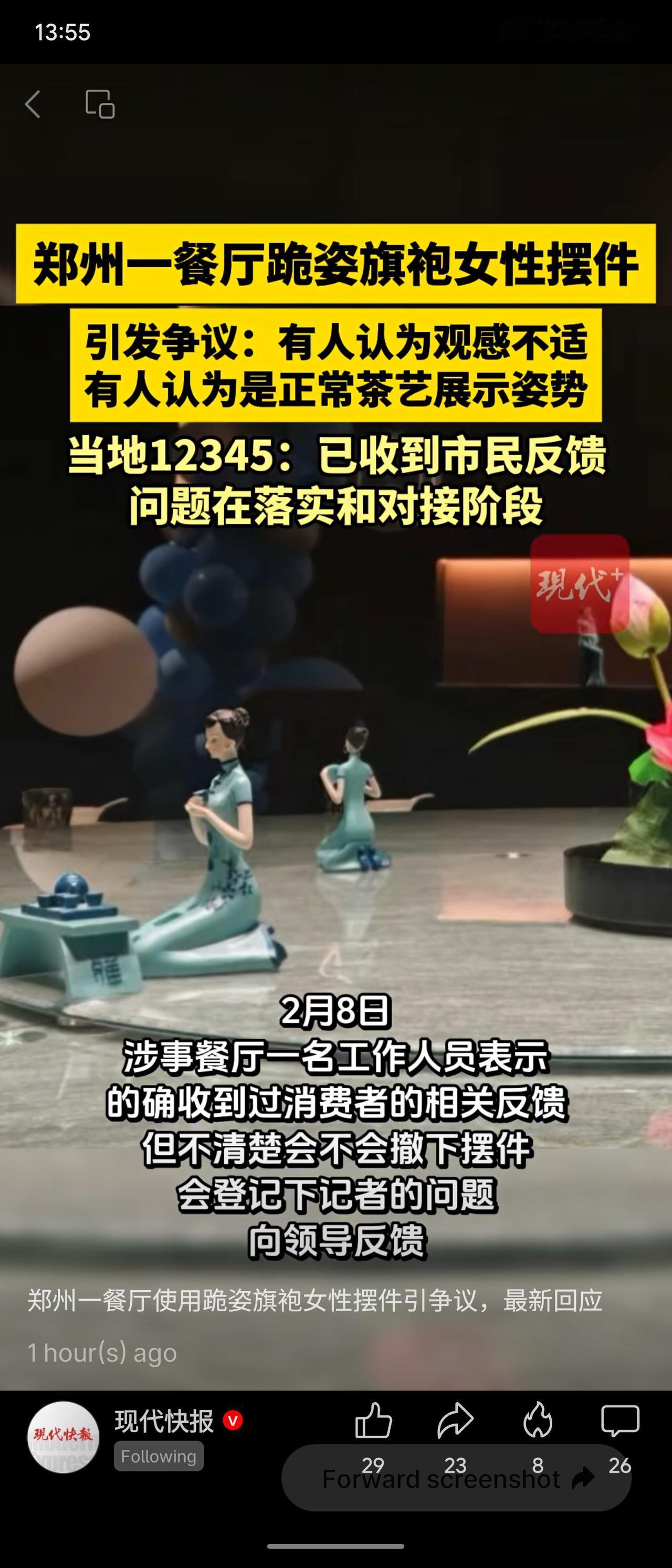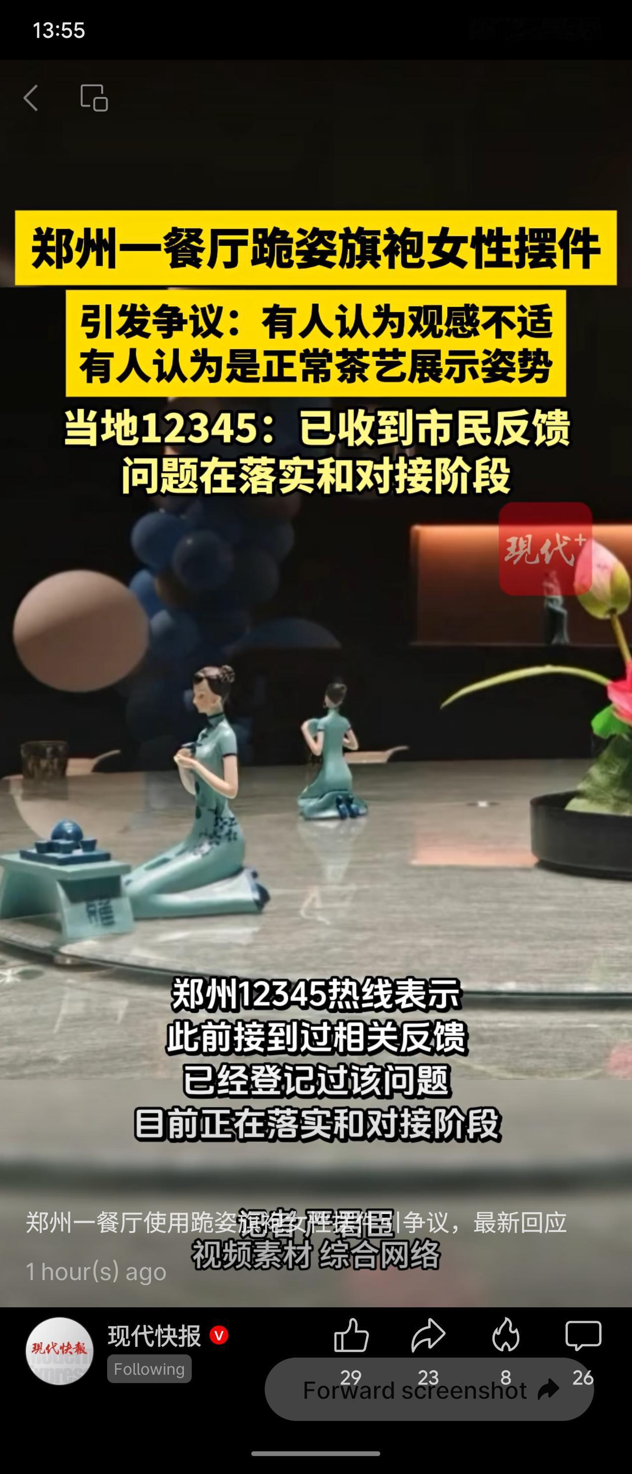 郑州一餐厅因摆放跪姿旗袍女性摆件引发争议。部分人认为此造型易引发不适,尤其被360度展示;另一观点则视其为传统茶艺姿势。目前12345已介入处理。事件反映出公共装饰需兼顾文化表达与公众感受,商家应审慎考量社会观感。