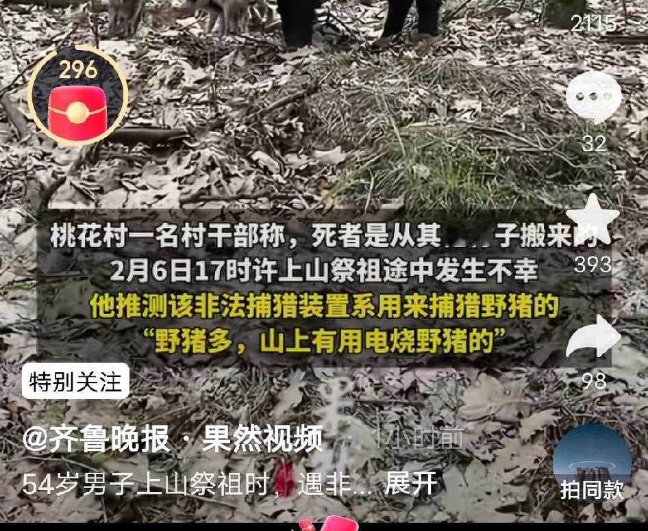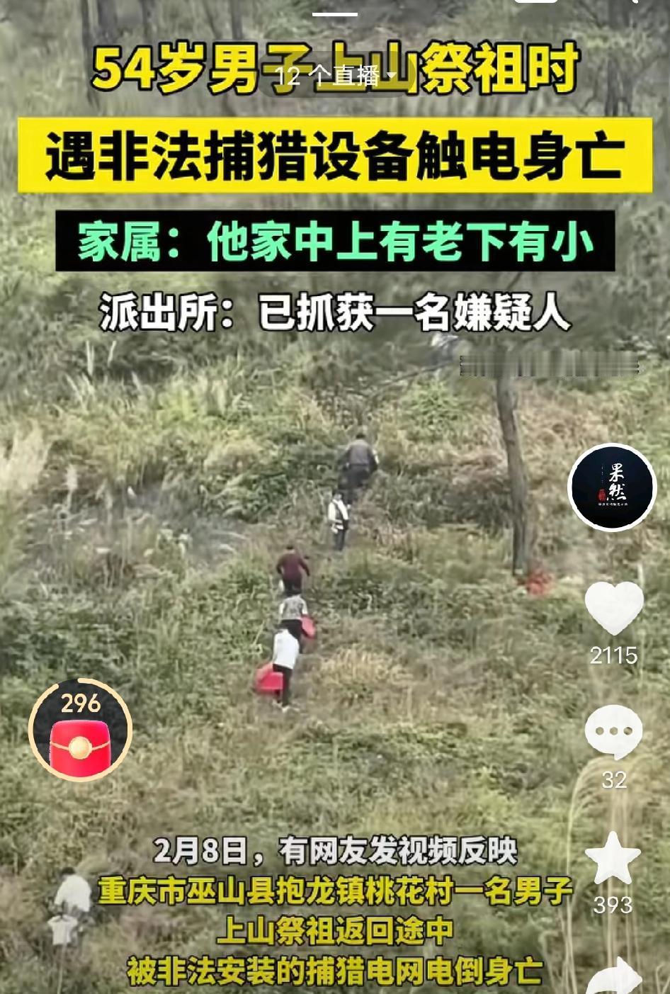 悲剧还是发生了!重庆一男子上山祭祖,就走了条村里走了几十年的熟路,居然误触了村民私设的高压电网,人直接没了!临走前还跟家里说“来路边接我”,这竟是最后一句话,家里80多岁老母亲、刚工作的孩子,一下就没了顶梁柱,好好的家彻底塌了!就为了捕几只野猪,把要命的电网藏在人常走的山路上,连个提醒都没有,这自私的侥幸,真的造了大孽! 2月6号下午,男子揣着祭品独自上山祭祖,那山路就一米来宽,两旁草长得密,却是村里人天天走的便道。下午5点20分,祭拜完往回走,想着很快就能到家,特意给家里发了信息让来接,谁能想到,这简单一句话,竟成了和家人的永别。 家里等了半天没见人,打电话也没人接,心一下子就悬起来了,赶紧喊上邻居,拿上手电筒上山找。沿着山路一路喊,山里就只有风声回应,走到一段草更密的地方,才看见男子倒在地上,身子早就凉透了,膝盖处的裤子烧出个焦黑的洞,皮肤都紫了。 而旁边草丛里,就藏着那套高压电网——电瓶裹着塑料膜藏在盒里,电线贴地缠在草里,不仔细瞅根本发现不了,连个最基本的警示牌都没有!布这网的人但凡有点良心,也不会把这要命的东西,藏在村里人天天走的路上啊! 谁能想得到,有人为了逮几只野猪,竟敢在公共山路上私设高压电网!桃花村村干部也说,当地野猪确实泛滥,经常成群糟践庄稼,农户一年下来亏不少,大伙儿都愁得慌,但再难也不能拿别人的命当赌注啊!为了自己那点收成,铤而走险不管别人死活,这也太自私了! 事发后派出所民警立马就来了,连夜查现场、固定证据,才一天时间,2月7号就把布电网的人抓着了,案子还在查。可就算抓得再快,大叔也回不来了,他家人现在还沉浸在悲痛里,手忙脚乱办丧事,尸检也做完了。老母亲常年有病全靠他照顾,孩子刚步入社会,这下顶梁柱倒了,一家人连往后的日子咋过都不知道,看着太让人难受了! 这事儿传出来,网友们看了心里又痛又气,大伙都在说: 有人心疼坏了:“太惨了!就是上山祭个祖,走的还是家门口的熟路,咋就出这事儿了!老人孩子以后可咋活啊,布电网的人太缺德了,必须依法重判,给家属一个公道!” 有人也懂村民的难处但更气这行为:“野猪糟蹋庄稼确实闹心,我能理解,可再难也不能犯法啊!把电网藏在人走的路上,还不设警示,这哪是捕野猪,这分明是藏陷阱害人,自私到顶了!” 还有人实在忍不住呼吁:“这可不是第一次了,好多乡村都有野猪泛滥的问题,总有人铤而走险私设捕猎的东西,相关部门真得管管了!不光要严惩违法的,还得想实招——安排专业的人管野猪数量,庄稼被糟蹋了给农户补点,再天天巡山查这些非法设备,从根上解决问题,别再让这样的悲剧发生了!” 而这事儿更该让所有人和基层部门好好反思:乡村野猪泛滥的难处,不能成为违法害人的借口,只有找专业的法子管野猪、给受损农户补损失、天天巡山守着民生安全,多方面一起使劲,才能让村里的山路变回安全的路,让每个出门的人,都能平平安安回家。 重庆大叔祭祖误触高压电网身亡 私设电网害人害己 乡村野猪泛滥治理 民生安全警示