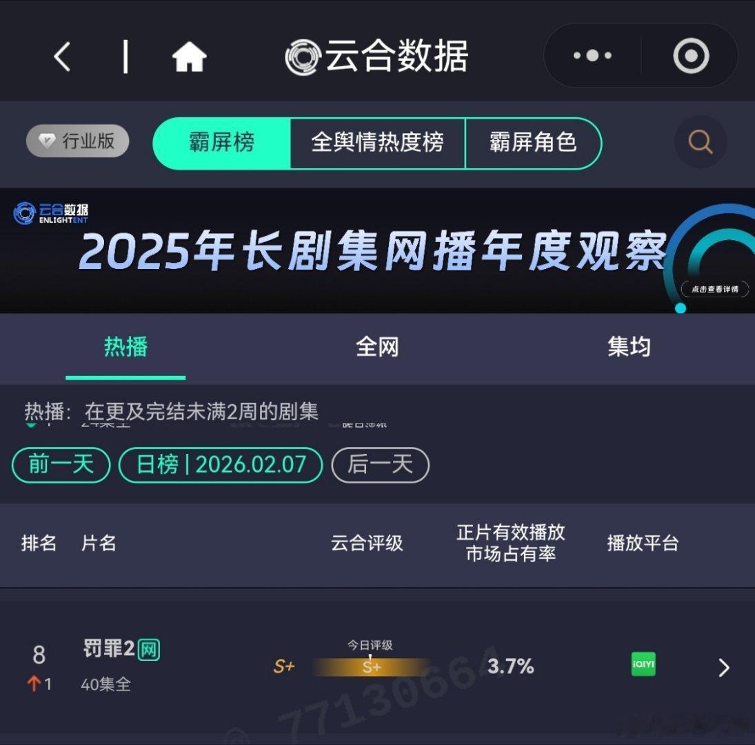 2月7日,罚罪2VIP更新结束第22天,今天排第8(升了1名),集均估(稍后更新)。V30已经固定,热播期预测还有7天,罚罪,云合第24。黄景瑜罚罪2黄景瑜秦枫