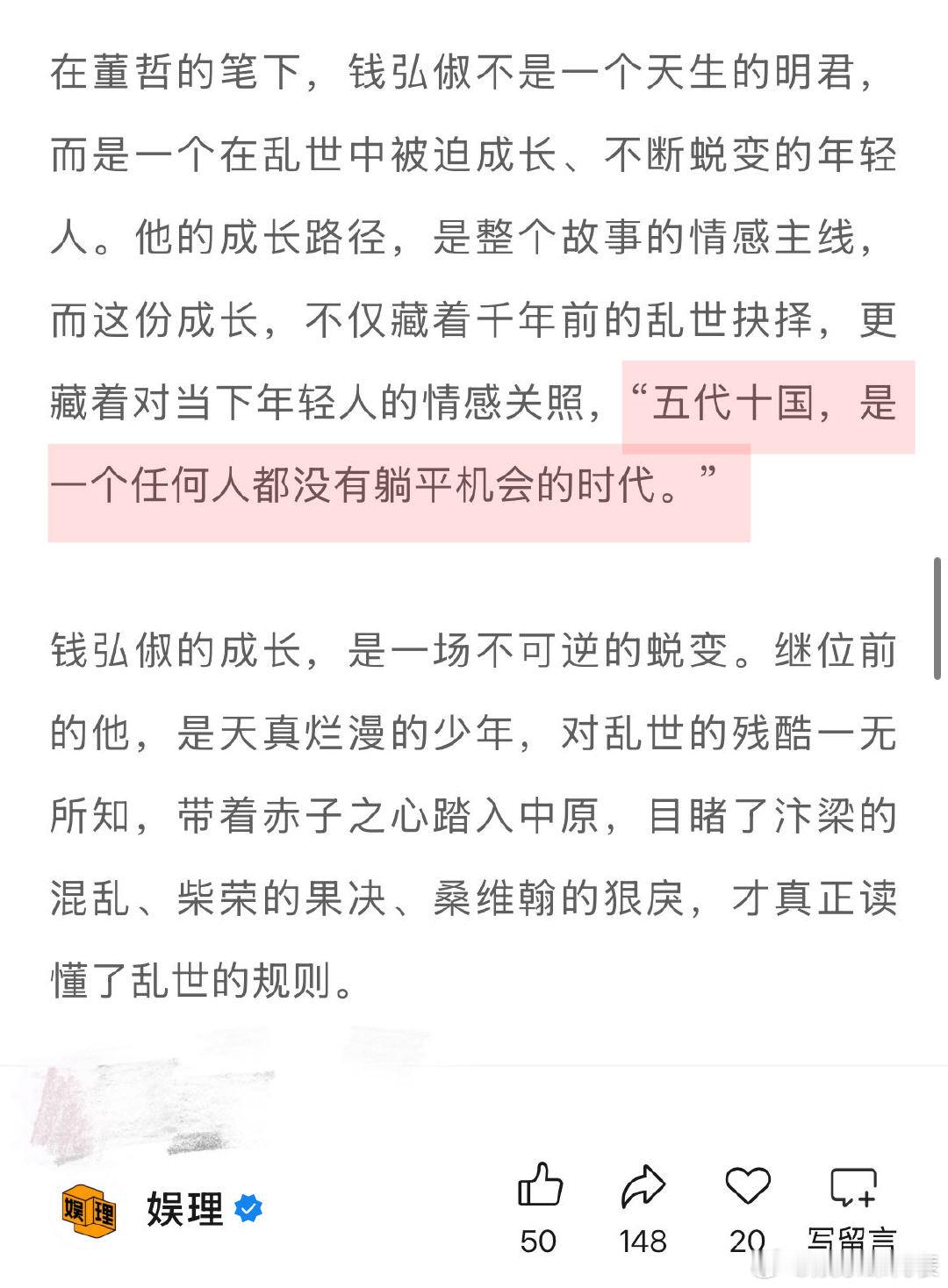 太平年编剧谈历史正剧创作边界 太平年编剧说五代十国没人能躺平 在《太平年》编剧董哲的笔下,钱弘俶不是天生的明君,而是在乱世中被迫成长、不断蜕变的年轻人。他的成长是故事的情感主线,不仅藏着千年前的乱世抉择,更藏着对当下年轻人的情感关照,“五代十国,是一个任何人都没有躺平机会的时代。”娱理独家↓